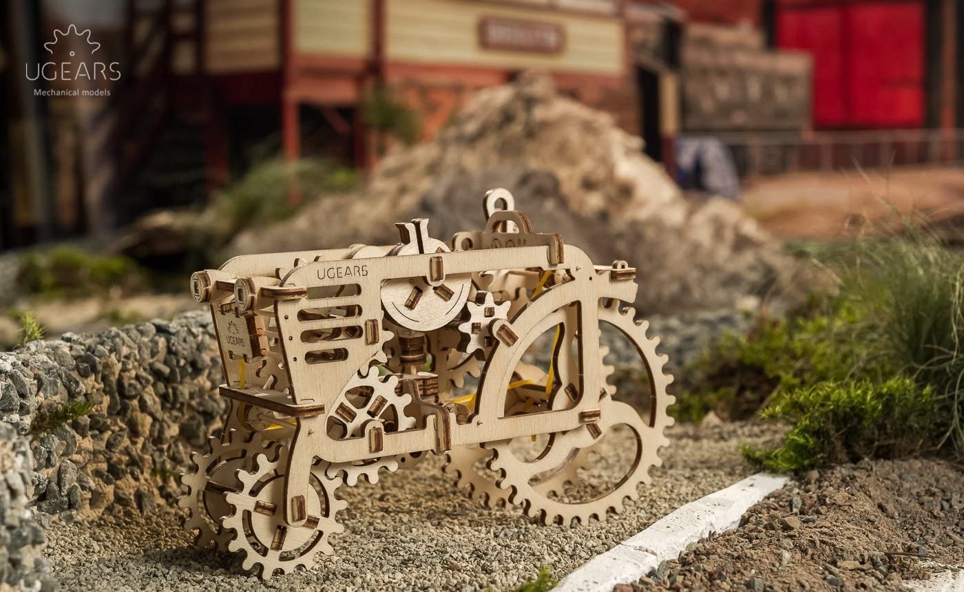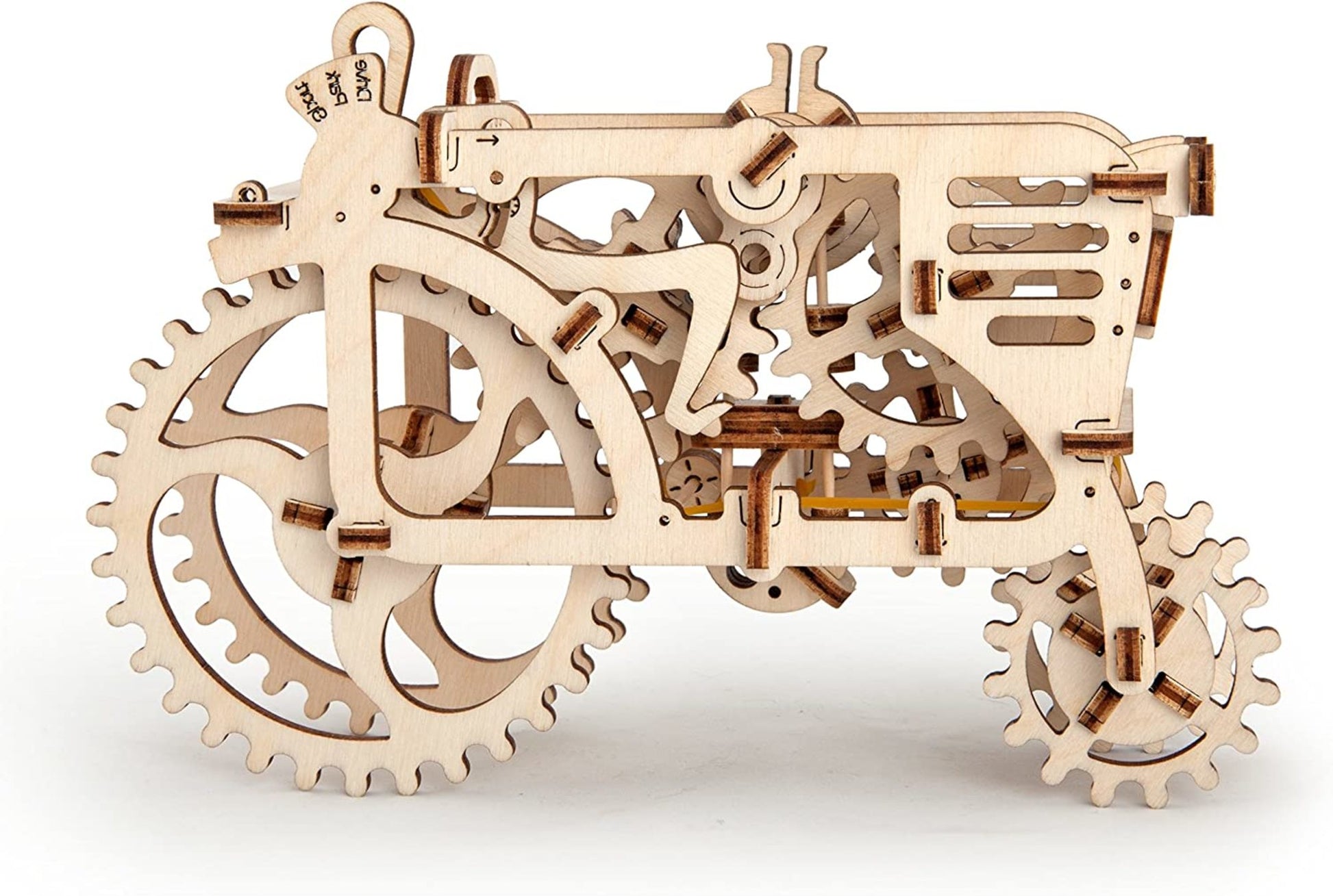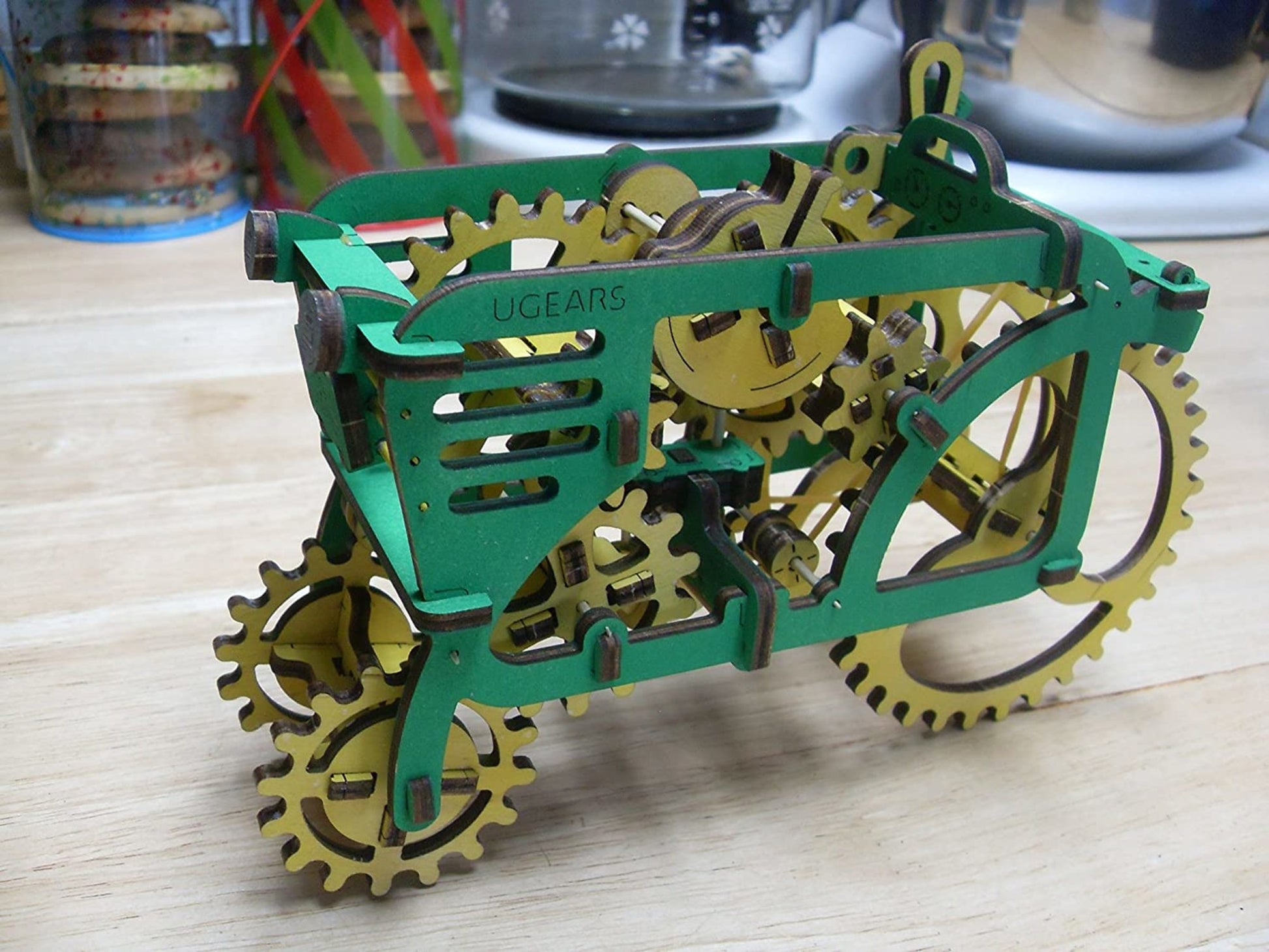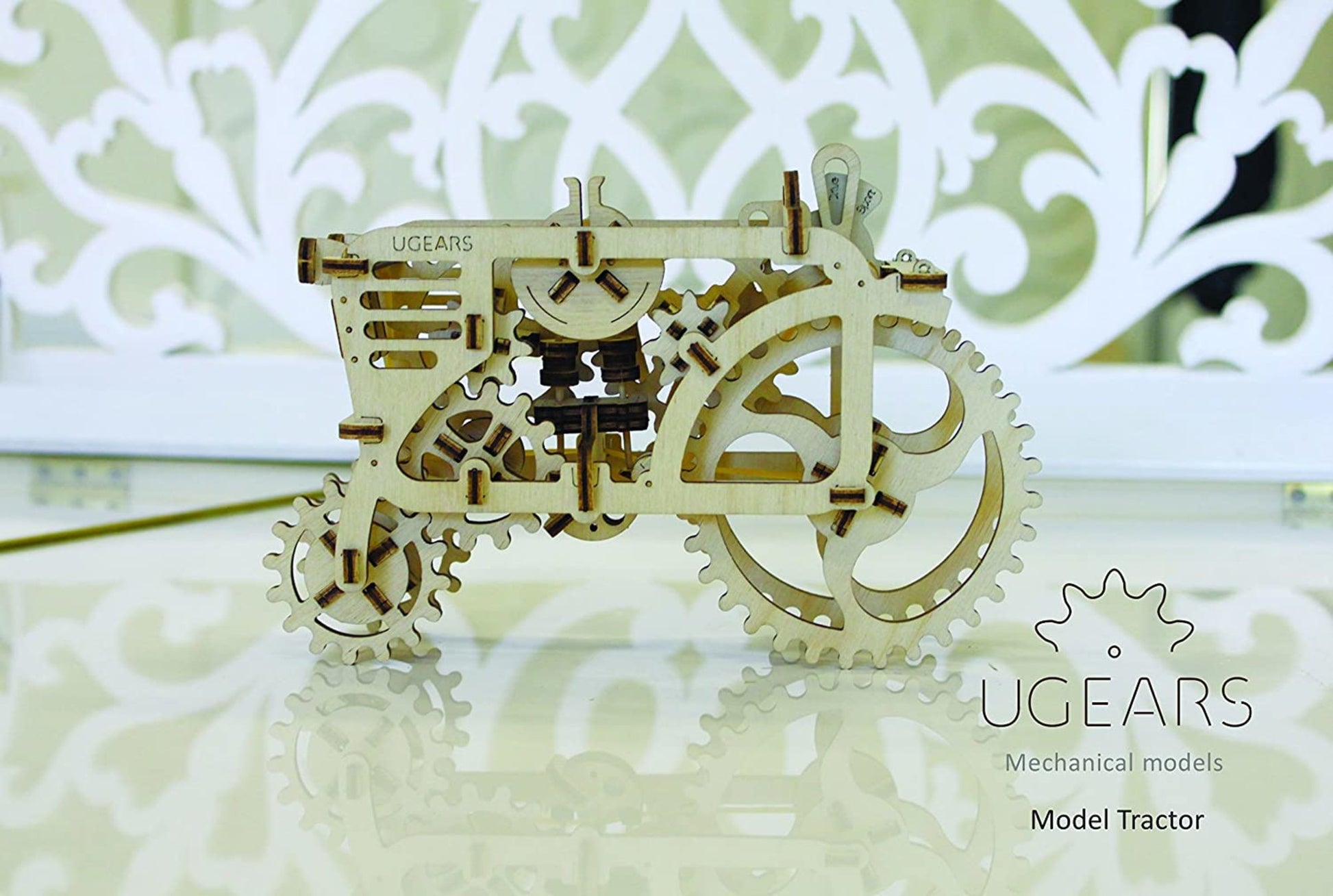 - Take to the fields this vintage model tractor by UGears, a rattling greeting from centuries past! This sophisticated, real-life mechanical toy requires no electronics to run. With parts made of high-quality plywood, it features a rubber band- activated all-wheel drive motor that allows this model to move on a flat surface at a speed of about 5 centimeters per second.