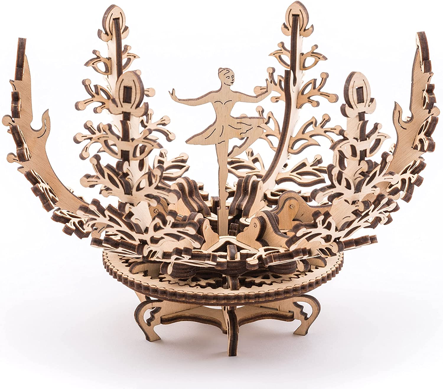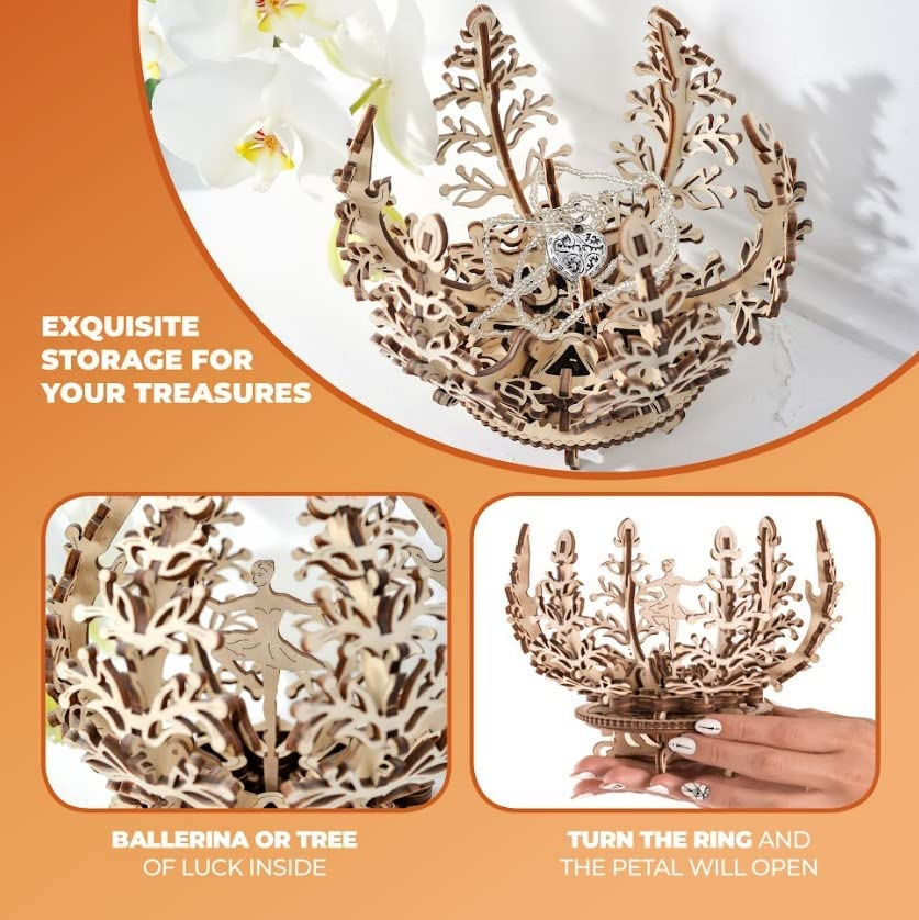 - 3D Flower Wooden Trick Mystery Puzzle: Elegant and stylish, the trick mystery puzzle has a reliable structure with a locking mechanism. It provides secure keeping of valuable items and prevents them from falling out. The kit includes two stands of different shapes in the form of a Ballerina and in the form of the Tree of Luck for bracelets.