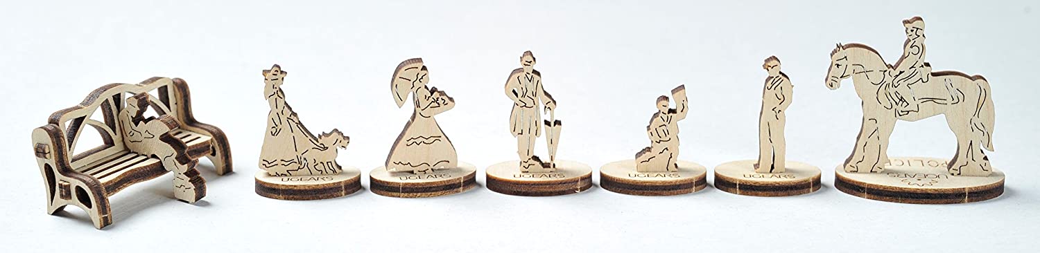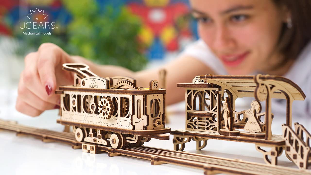 We are introducing a Tram Line Model – the first mechanical model from the new Mechanical Town Series. The model which you can build with your own hands, look and feel each part, each movement of transport vehicles, surroundings, play and create your own stories with people who are living in this town. The new model has gaming component and made entirely from wooden materials. It’s great for hobby & collection. Each part has a unique design and interesting engineering. UGEARS’ Tram Line model doesn’t need glue or special tools or even toothpicks to connect parts, which makes putting it together even more exciting. The fully assembled model retains moving parts and elements and remains entertaining and educational for family projects. Tram Line model consists of 14 parts, which come in a convenient scale for building and playing with.- Tram Car is equipped with an overhead pantograph for stepping it up to “drive” mode and a knob for opening and closing doors. Wind-up of the tram car and watch it move on the rails, entering into the Depot. After turning on 180 degree on the turntable, it moves on its own to the end of the line. There is no electricity inside: just gears, wheels, cranks, rubber band engine and tons of fun!