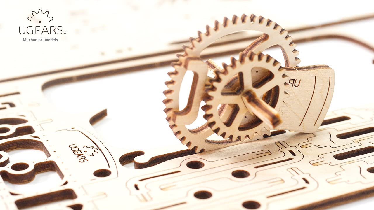 The cutting is well done; each of the parts comes out of the plywood sheets easily. No glue and special tools are needed for putting the model together. You can assemble it at home on the table. Fits together like a puzzle without glue or special tools thanks to Ugears’ patented plywood joints.