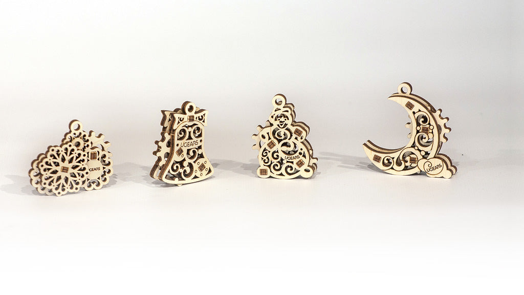 - The unique set of 4 individual miniature models for self-assembly for grown-ups and kids from 5 years to 80 and beyond. The set includes Bell, Snowflake, Moon, Snowman. Each model has basic elements of mechanics.