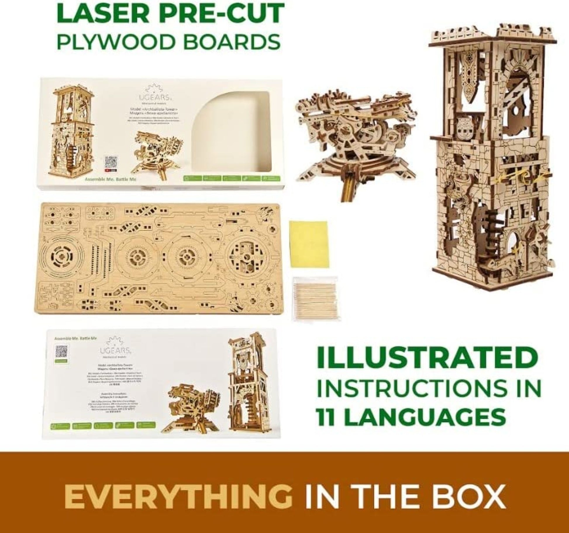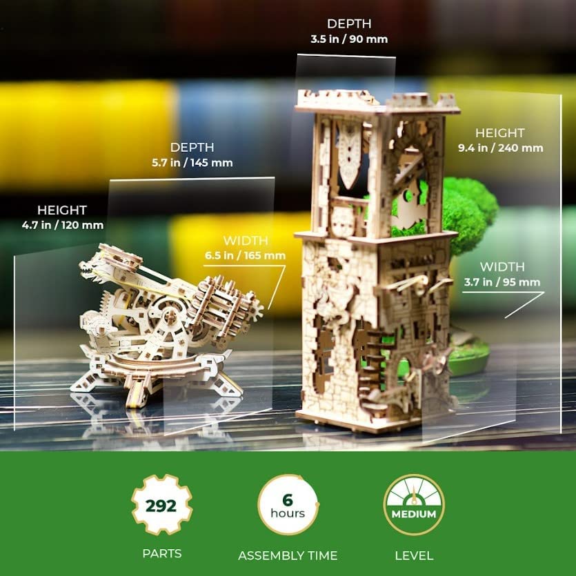- A COMPLEX DESIGN: The UGears model comes with two parts, the actual arch ballista and the tower, yet we have incorporated many technical surprises like the fact that you can attach the firing module directly to the top of the tower. Don't also forget about the wooden details and the ivy-cloaked castle tower with a dragon model.