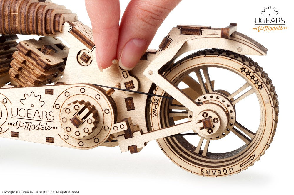 If you're like us at Ugears, you've been spending a lot of time indoors lately. Is life getting a bit too predictable, too routine? Do you miss traveling? Is the open road calling your name? Have you ever dreamed of the freedom of two wheels? Time to turn your computer off and pull your leather jacket on! But wait...before you drop ten grand in the showroom at your local motorcycle dealer on that Triumph or Harley-Davidson you've always dreamed of, may we suggest you first take a test drive with the Bike VM-02 3D wooden puzzle from Ugears?