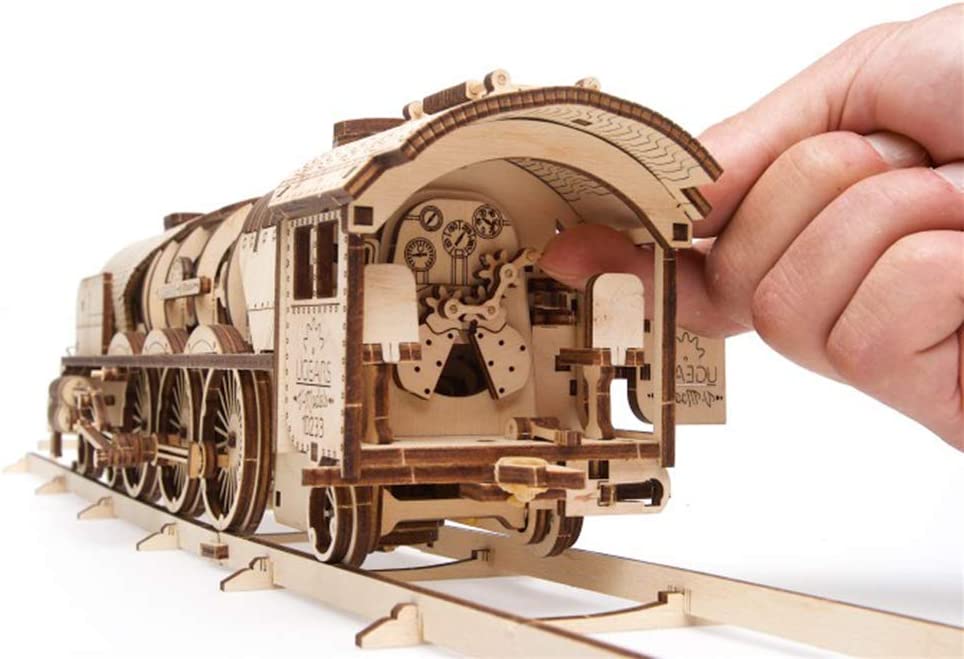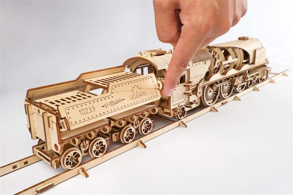 - CONSTRUCTION: The UGears V-Express Steam Train with Tender model kit is made of sustainably sourced high grade wood and has everything you might need for assembly. The quality of the parts is top-notch: a laser method is used for cutting items from a plywood board that provides precise hairline cuts