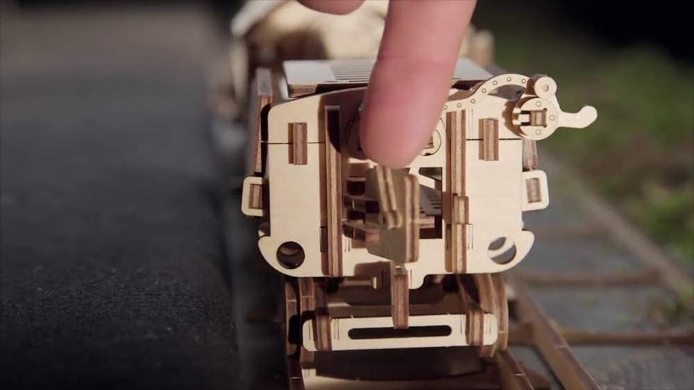 Like all of our mechanical models, 3d puzzles, wooden puzzle boxes, robots, automatons and kinetic sculptures, the Ugears V-Express Steam Train is not simply a beautiful static model, it's a working piece of machinery. One full winding will give your V-Express enough energy to cover a distance of up to four meters (13 feet) as you send it down its track. You can change the direction of movement by switching a small lever on the side of the locomotive's body. The locomotive has three settings: forward, back and idle. When the mechanism is in idle you can observe the workings of the moving elements without having to worry that your train will race off, as it does in forward mode. The other exciting option of your new model is to switch it to “back” or reverse setting, then watch as your V-Express locomotive rolls backward and automatically hooks up with its coal Tender.