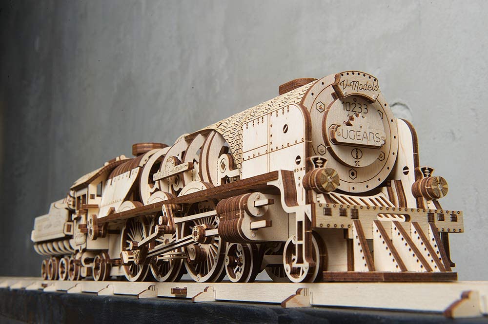 Ugears, a wooden model and 3D puzzle company known the world over for its outstanding, retro mechanical designs, pays tribute to the fascinating Victorian era with our V-Express Steam Train with Tender working train model. The steam locomotive is a standout symbol of the Industrial Revolution and Victorian age. Trains and transcontinental railroads opened up the interiors of continents, heralding an age of global technological and economic transformation. For all you train lovers and 3D puzzle enthusiasts, the beautiful steampunk V-Express will take you on a creative journey to an exciting age of invention, innovation, romance and transformation.