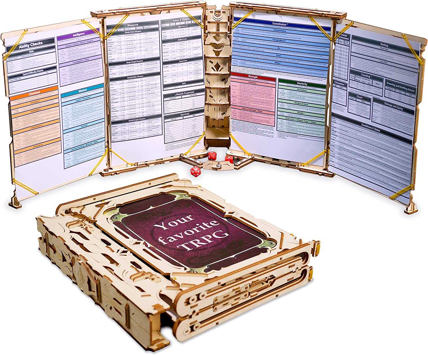 This convenient and beautiful looking device is easy to assemble and even easier to use. The fantasy inspired detail of the wooden panels is designed to make you feel like a real Master of the Game holding an ancient folio about an adventure, the greatest of them all.