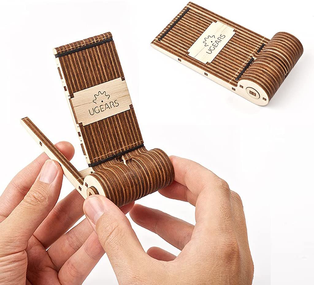 Following the modern trend of minimalistic and functional design, Ugears is proud to present a new clever and practical addition to their collection of wooden mechanical models, the Foldable Phone Holder of the Mini-series.