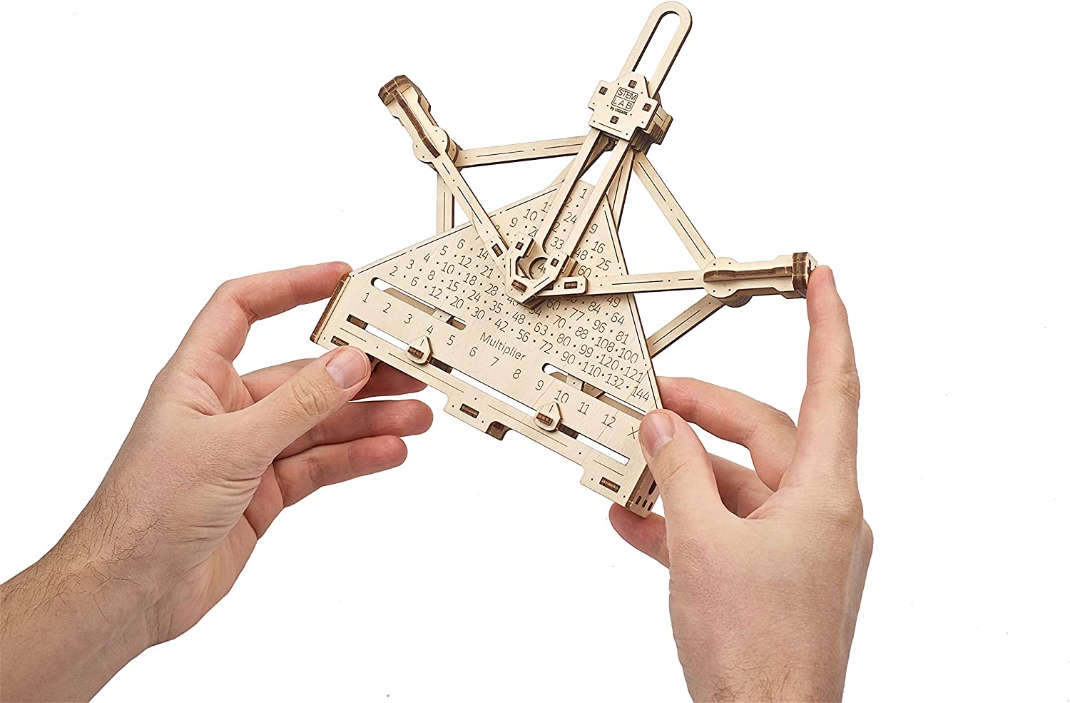 The UGEARS Mechanical Multiplier is a fun wooden 3D puzzle based on a children's toy, “Consul the Educated Monkey,” invented in 1915 by William Henry Robertson, an American high school math teacher. Robertson applied for a patent for a toy that ingeniously uses a hinged mechanism to perform simple multiplication, designed "to stimulate children's interest in the study of numbers.”
