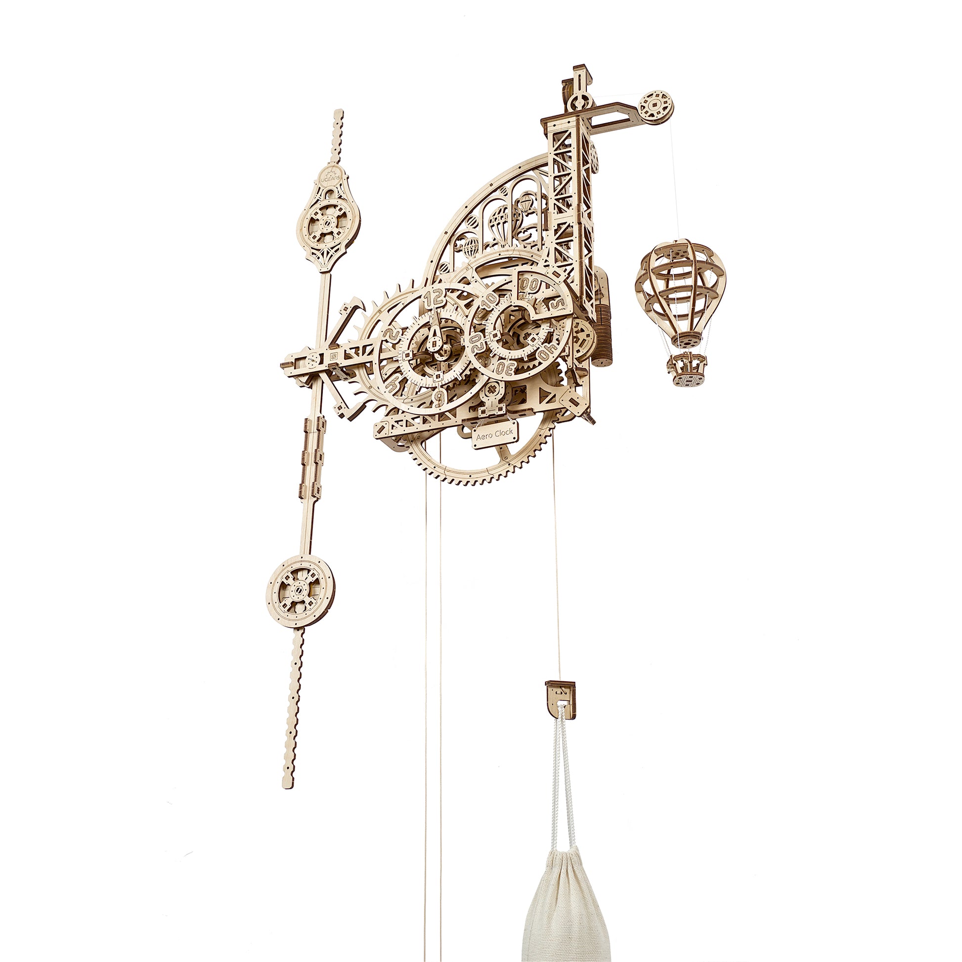 This simple-yet-elegant Ugears clock is driven by the force of gravity pulling down a weighted bag (you can fill the bag with sand or salt). Raise the bag on its pulleys to wind the clock. As the weight slowly descends, it rotates a drive gear, which then rotates an escape wheel through a reducer. The clock features an adjustable weighted pendulum which interacts with the escape wheel through the steady tick-tock of the anchor mechanism. You can adjust the clock's ticking action to the second, by sliding the pendulum's top and bottom weights. The reducer also transmits rotation to an hour disc and a minute disc. One of the interesting features of our Aero Clock is that time is not read with rotating hands on a clock face, but rather a fixed pointer indicates time on the slowly-rotating, numbered hour and minute discs. Moreover, these discs rotate counterclockwise—did you know that before standardization, some clocks moved clockwise while others moved counterclockwise? In the role of "cuckoo” the Ugears Aero Clock features a model hot air balloon. The suspended balloon rapidly descends when the hour strikes, then slowly rises again over the course of the next hour.