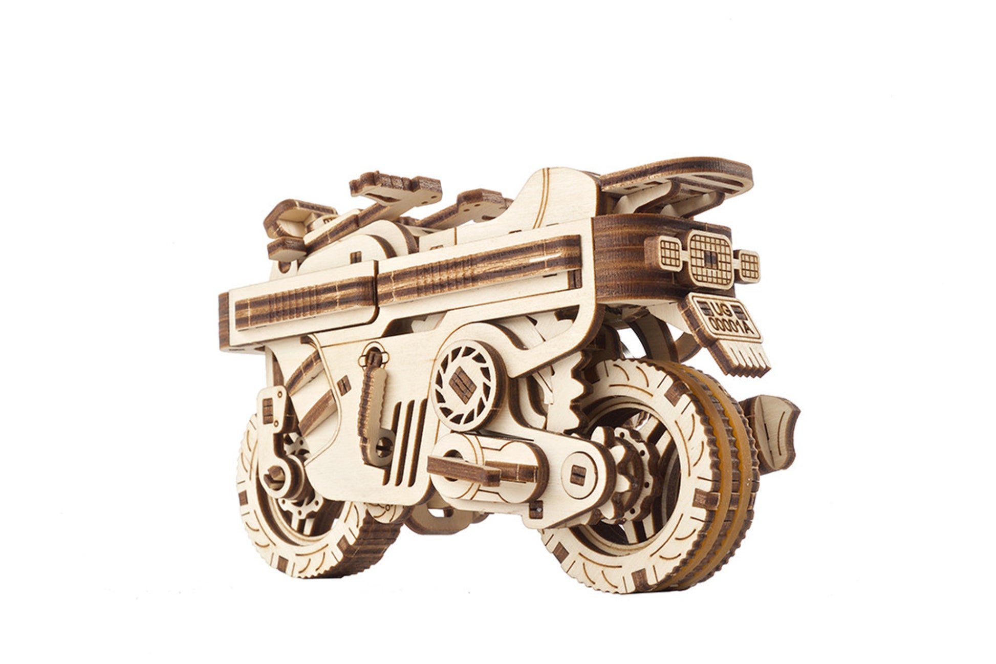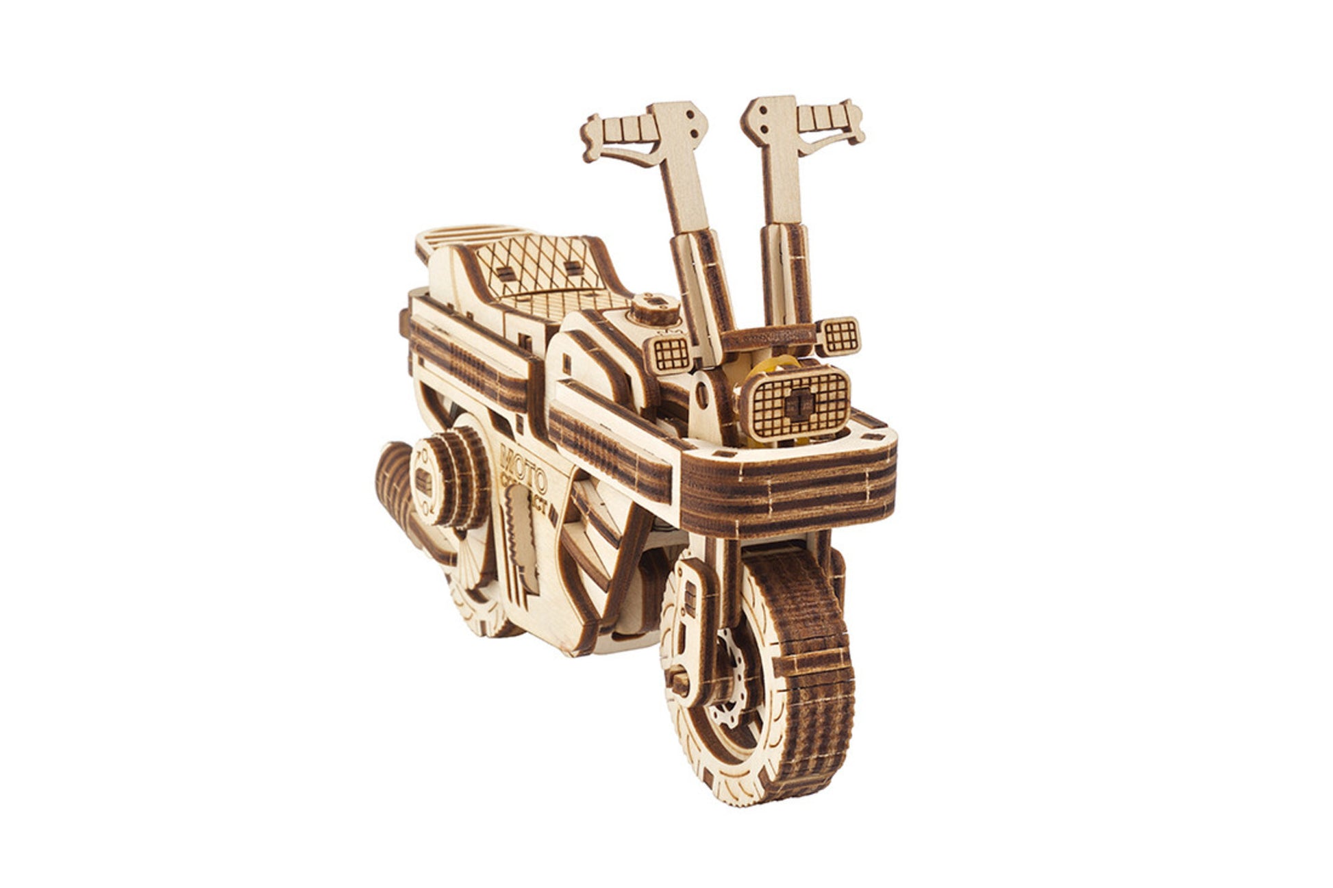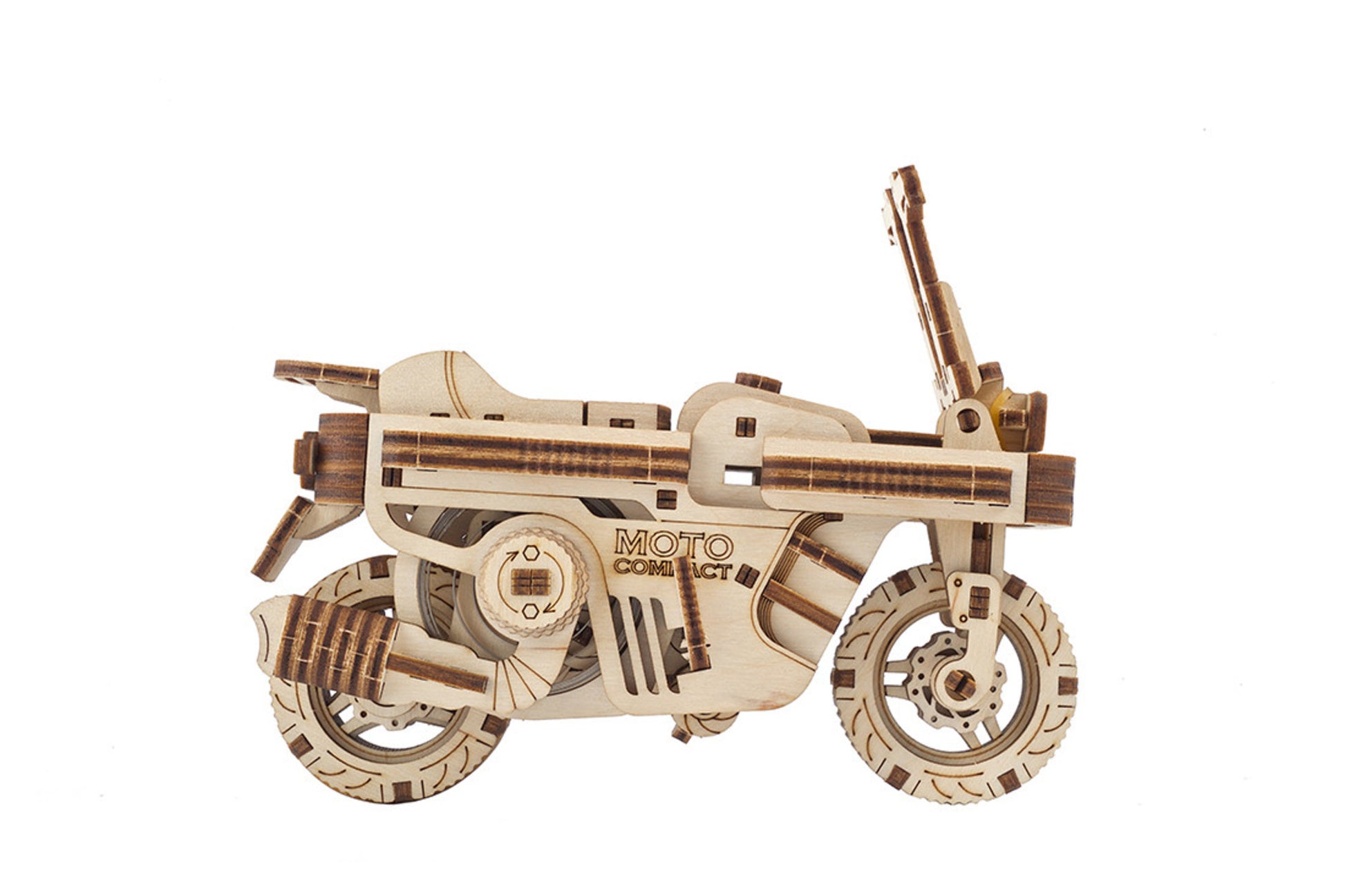 - Sophisticated miniature: The Moto Compact Folding Scooter is a UGears two-wheeled DIY building kit and motorcycle model for adults. This motorbike toy is driven by a spring-loaded engine and is able to travel 2 m (six feet) on a single wind-up. It features front and rear suspension and a complex folding mechanism for safe and easy transport
