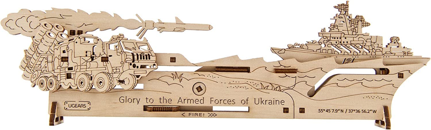 The Ugears Neptune Mission model depicts a Ukrainian R360 Neptune missile system firing a cruise missile at the russian cruiser moskva. The missile hits the ship, sinking it. The mechanism of the model is very simple: one gear moves both missile and cruiser towards each other. A sliding guide hole causes the rear of the cruiser to sink. Engraved on the front of the model are the exact coordinates where the flagship moskva, the pride of the russian fleet, sank to the bottom of the Black Sea.