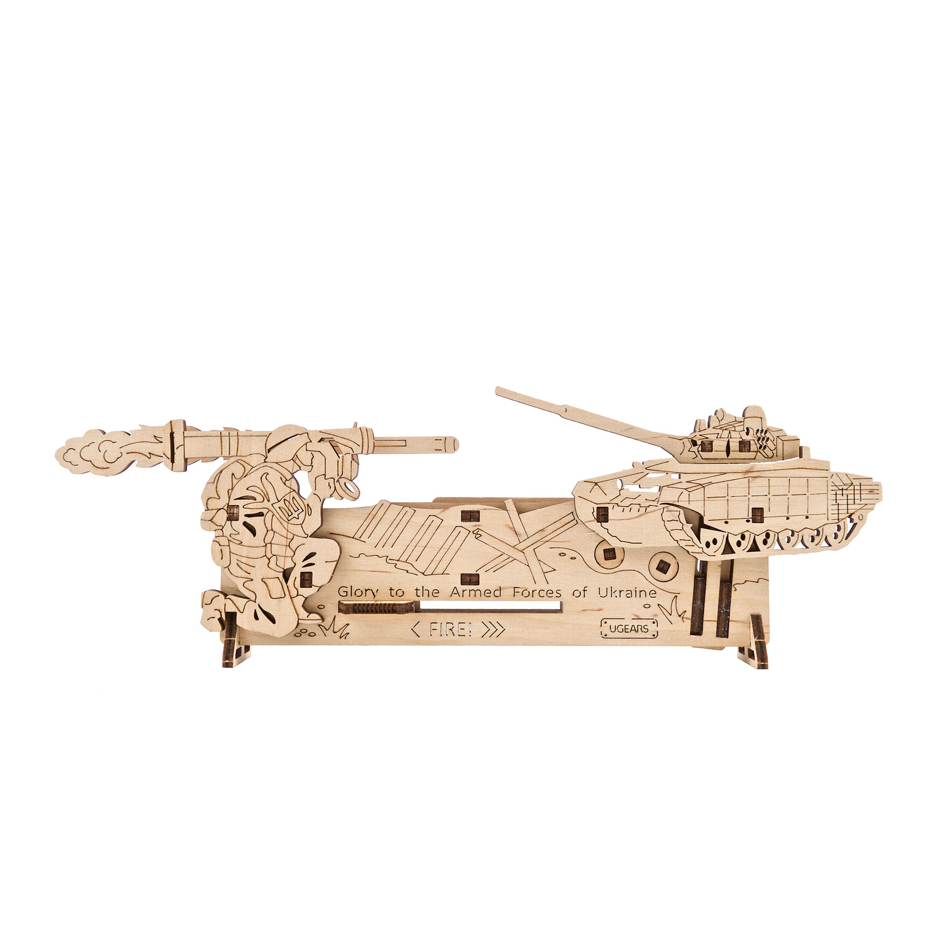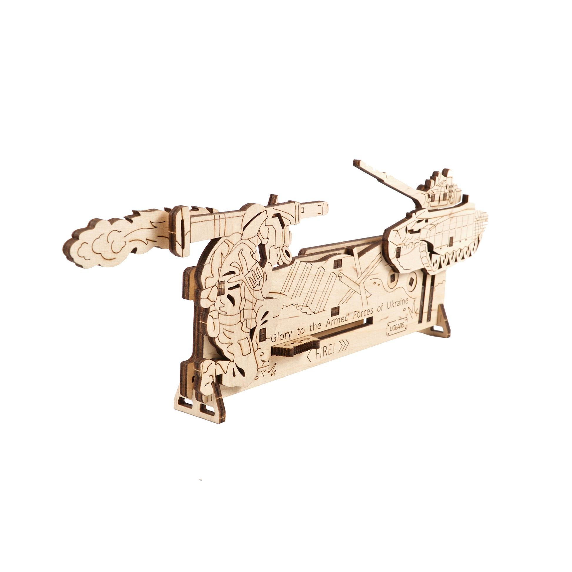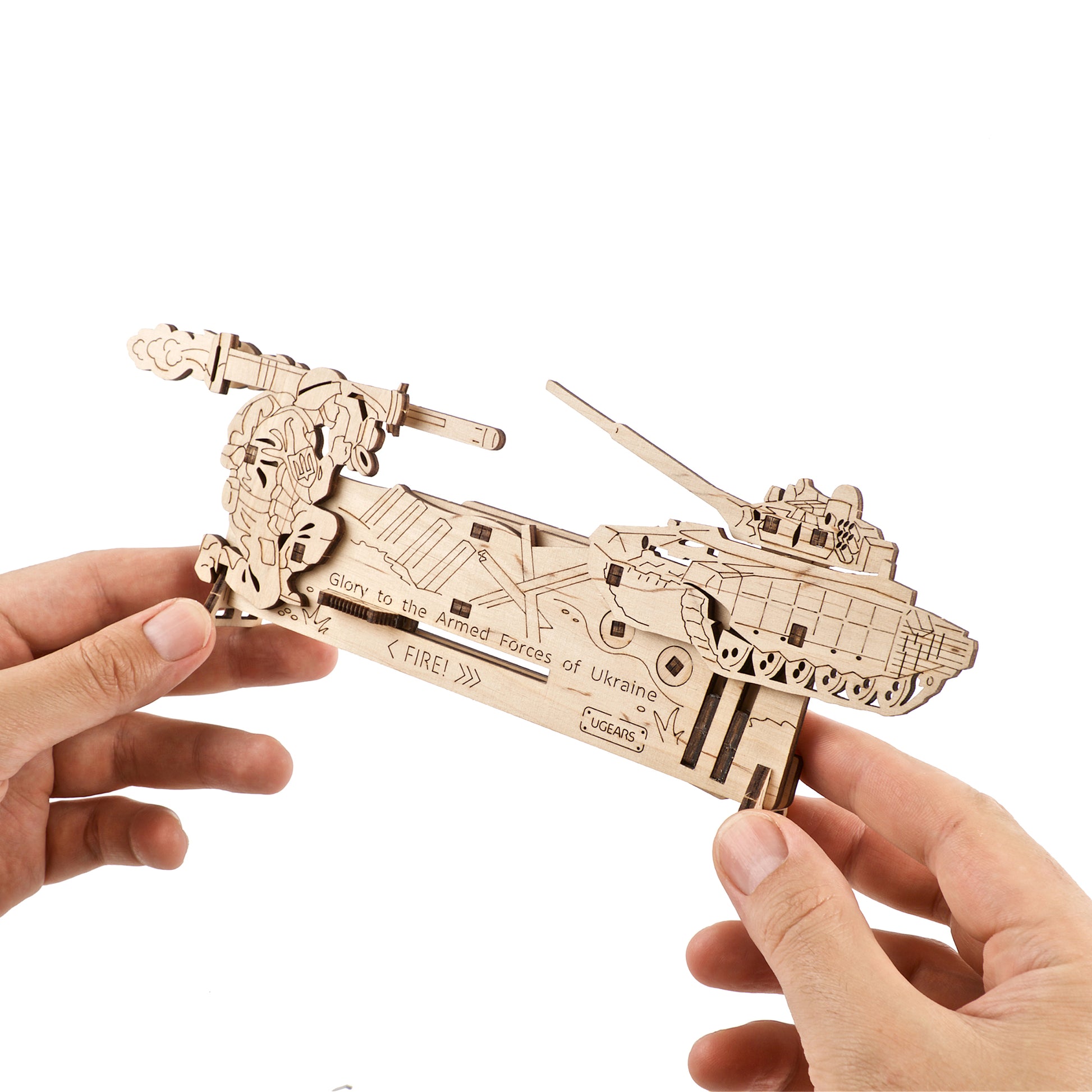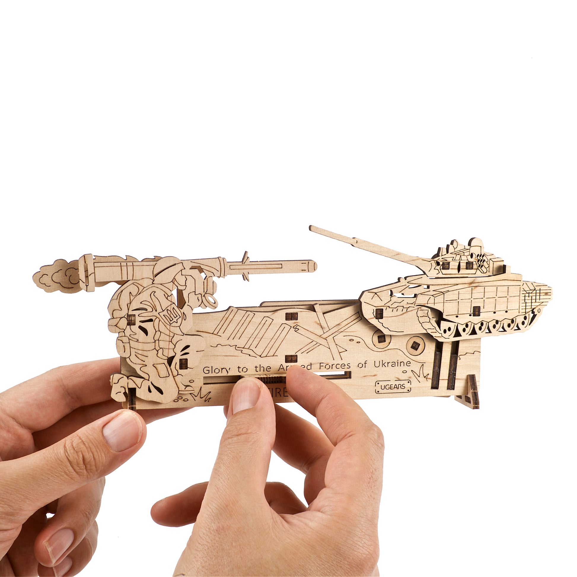 Ugears engineers and designers have been inspired by real stories from the front. The Fire and Forget model depicts a soldier of the armed forces of Ukraine, bravely getting up close to fire a shot from his Javelin portable anti-tank missile system and destroying the occupiers' T-72B3 tank. The Ukrainian defender is clever and accurate, and the enemy tank pays the price. Relive the glorious moment again and again as you operate the slide. The model's gear system propels the rocket into the tank, causing its turret to blast off up and to the right. For the Ukrainian soldier, the encounter is all in a day's work—he is already looking for new enemy tanks to hunt. For the invader, forget it!