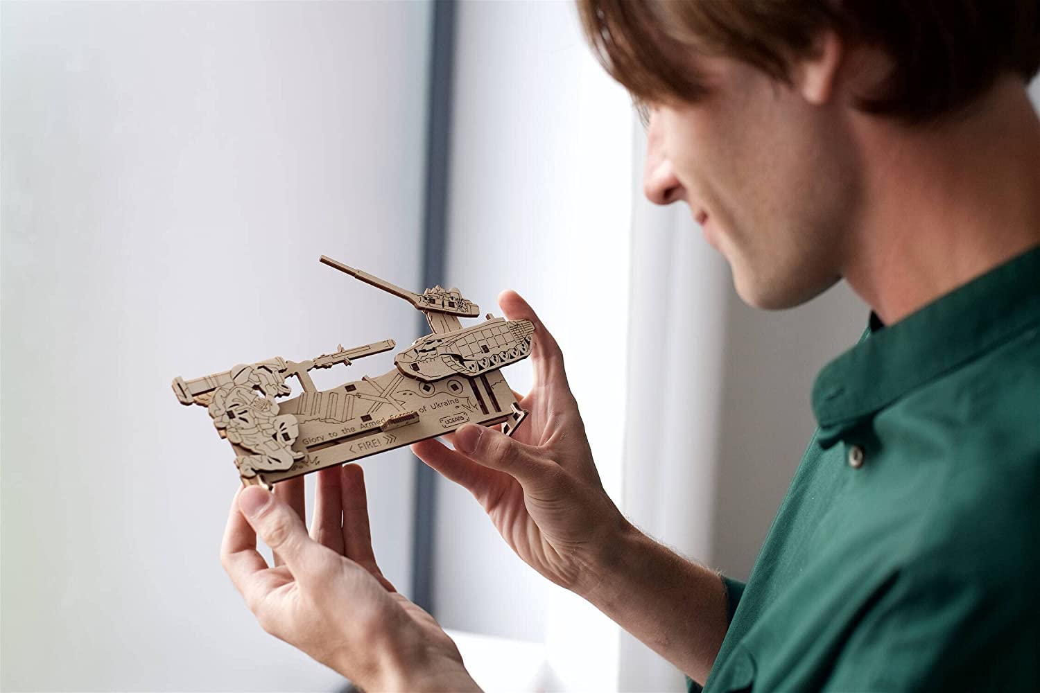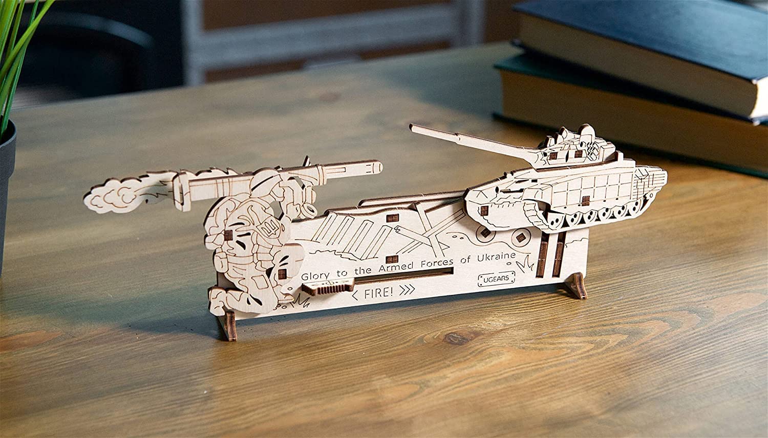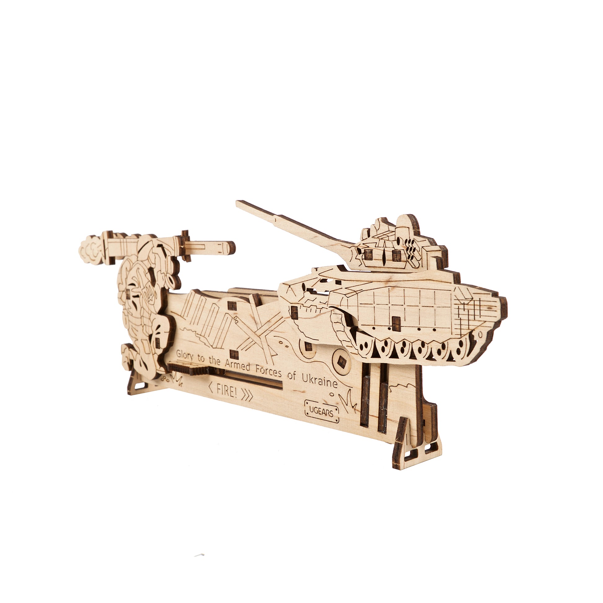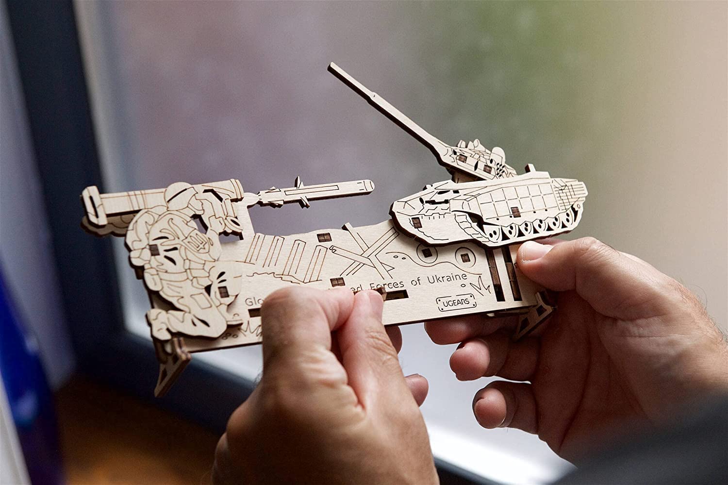 Ugears engineers and designers have been inspired by real stories from the front. The Fire and Forget model depicts a soldier of the armed forces of Ukraine, bravely getting up close to fire a shot from his Javelin portable anti-tank missile system and destroying the occupiers' T-72B3 tank. The Ukrainian defender is clever and accurate, and the enemy tank pays the price. Relive the glorious moment again and again as you operate the slide. The model's gear system propels the rocket into the tank, causing its turret to blast off up and to the right. For the Ukrainian soldier, the encounter is all in a day's work—he is already looking for new enemy tanks to hunt. For the invader, forget it!