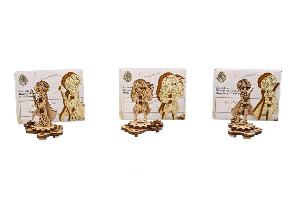 - Models in the Harry Potter™ Advent Calendar collection are made of attractive natural composite wood, and include figurines of Harry Potter™, Hermione Granger™ and Ronald Weasley™ that rotate on spinning gear platforms, as does the Goblet of Fire™. As you open the windows one by one you'll get to build iconic Harry Potter™ items, like spinning badges with the emblems of the Hogwarts™ School of Witchcraft and Wizardry and its four houses—Gryffindor™, Hufflepuff™, Ravenclaw™, and Slytherin™. These badges and many of the other items you will build are U-fidgets: fun little mechanical toys with spinning gears to keep small hands occupied. Assembly is fun and easy and can be accomplished in a few minutes.