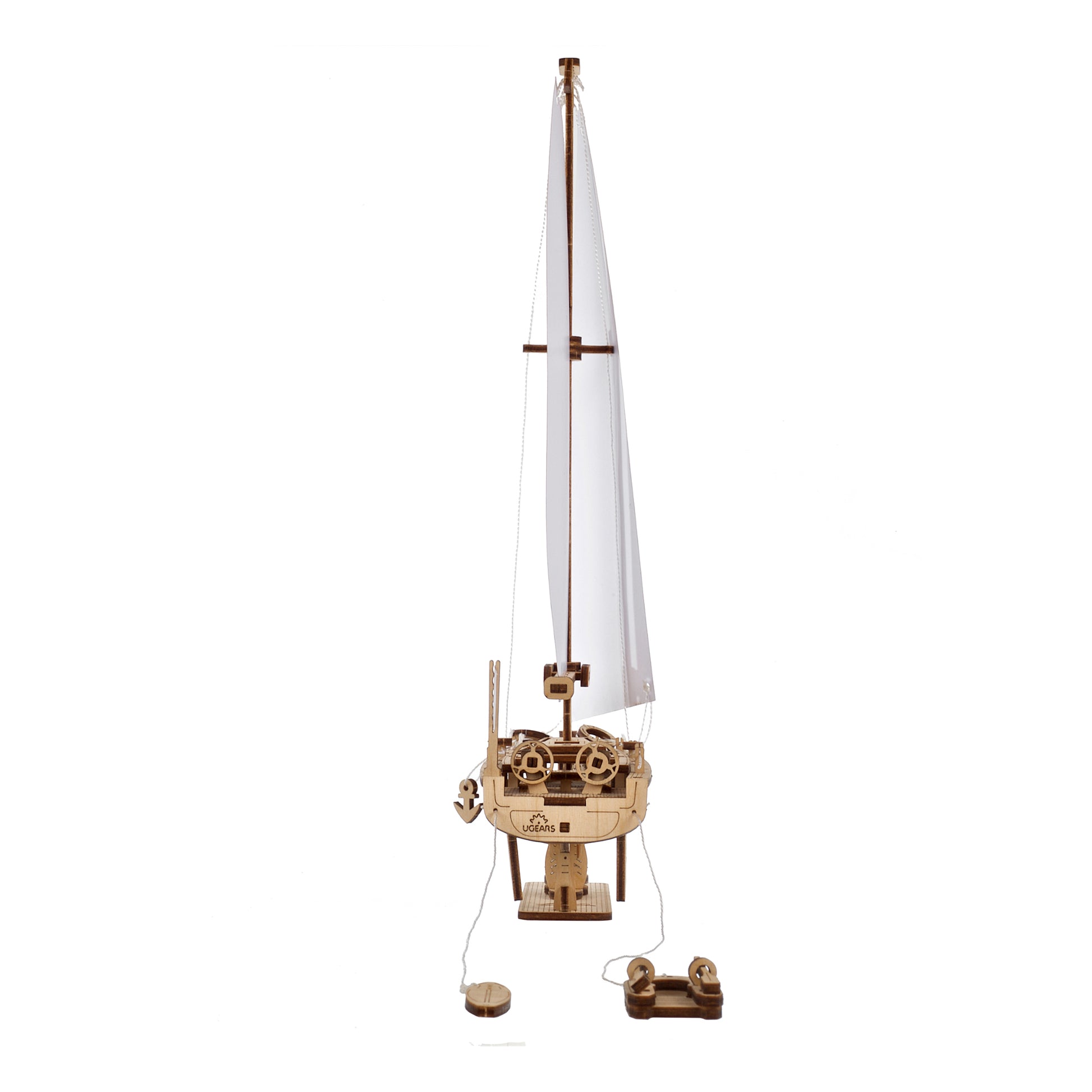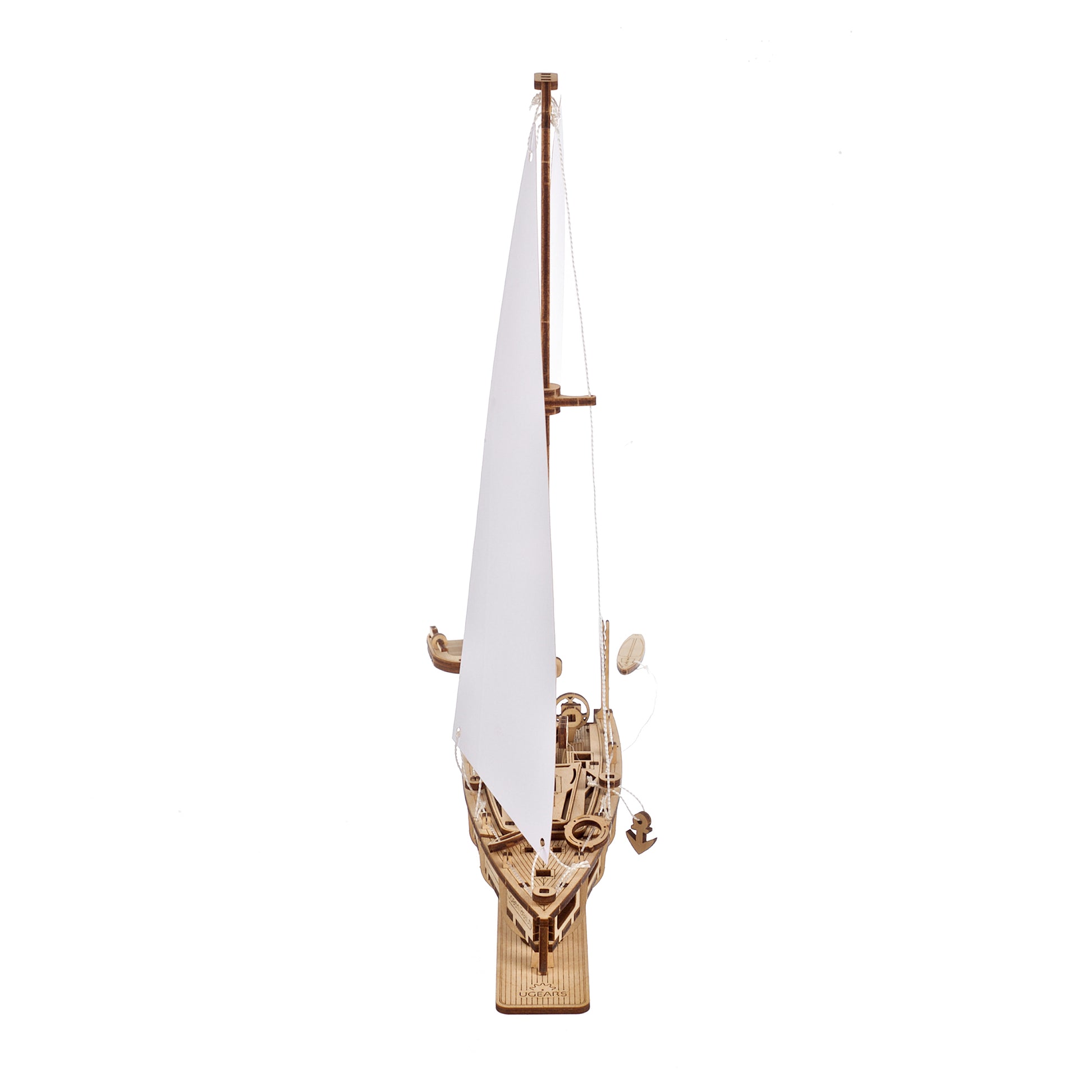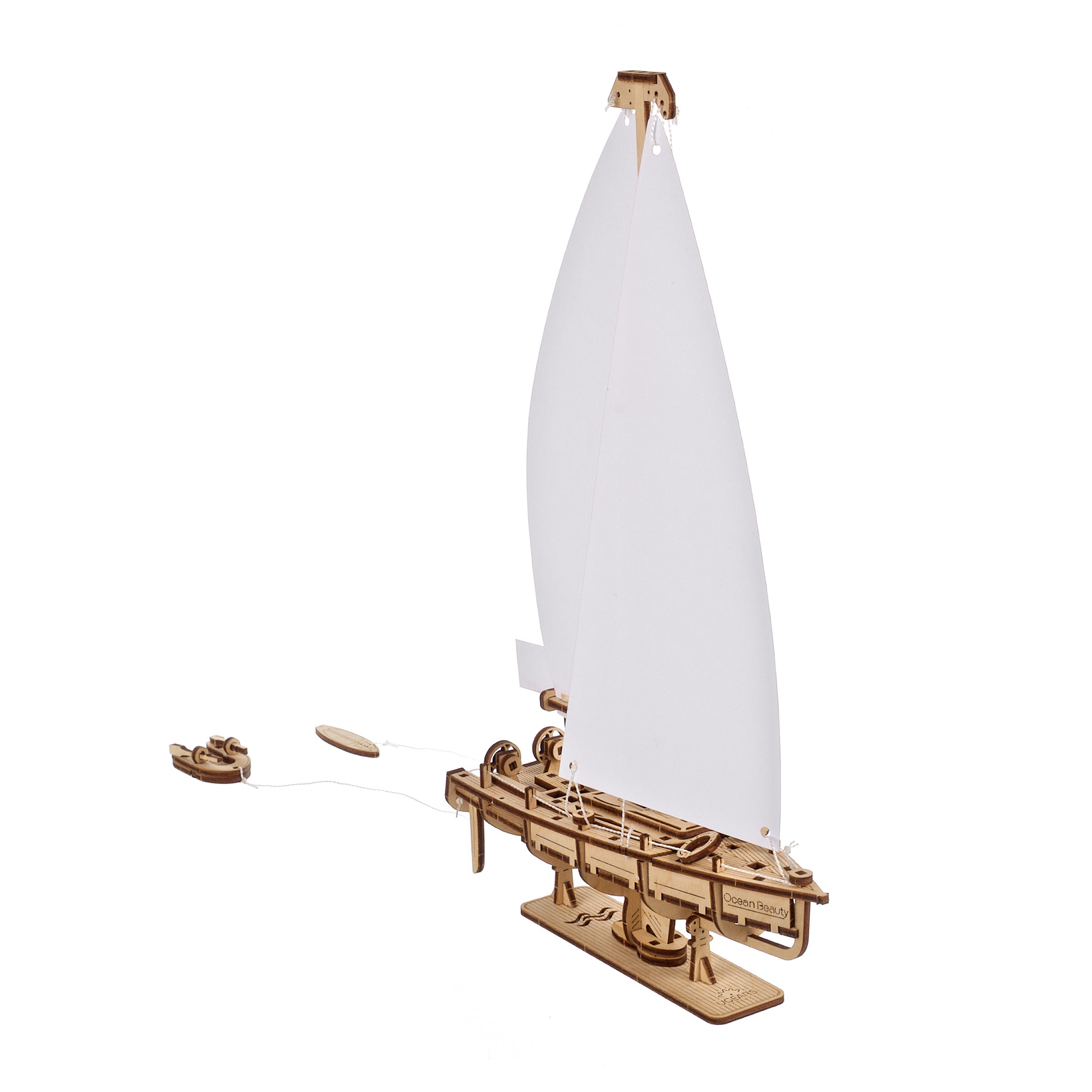 Catch the wind, feel the salt breeze, take to the seas or go island hopping in the stunning Ocean Beauty Yacht by Ugears. This DIY wooden model sailing vessel is a beautiful static model, with two gleaming white paper sails, and comes with its own sturdy stand for display on your shelf, mantle or desk. The model is somewhat different from other Ugears mechanical models in that the Yacht doesn't have gears and isn't propelled by a spring or rubber band motor—it's rather meant as a handsome display piece for your home or office decor.