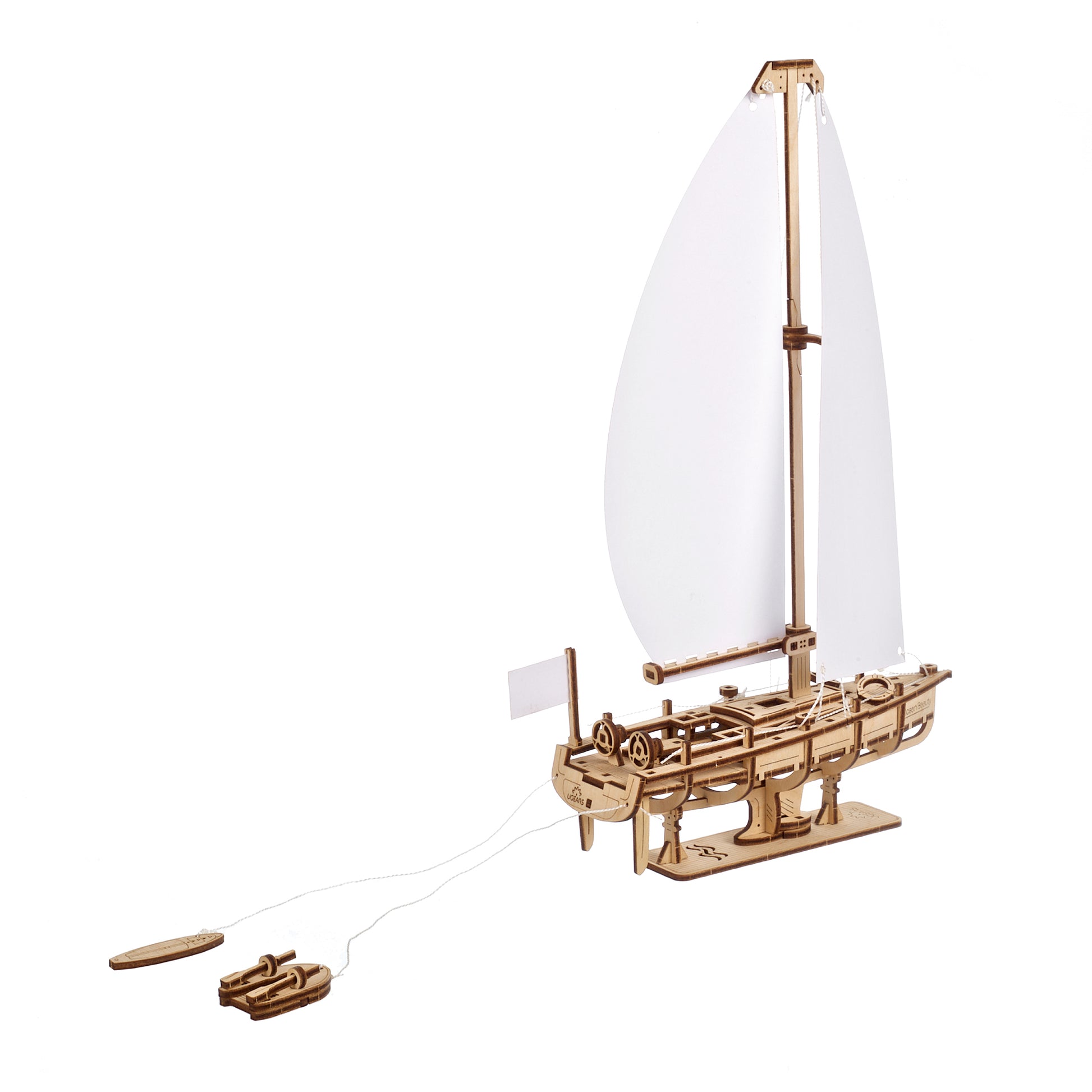 - Interesting features: This 3D puzzle wooden yacht model features a large cockpit with twin wheels that spin and an open transom, for draining seawater when you take a big wave on the nose that washes over the deck. There's also a surfboard that can be towed for fun!