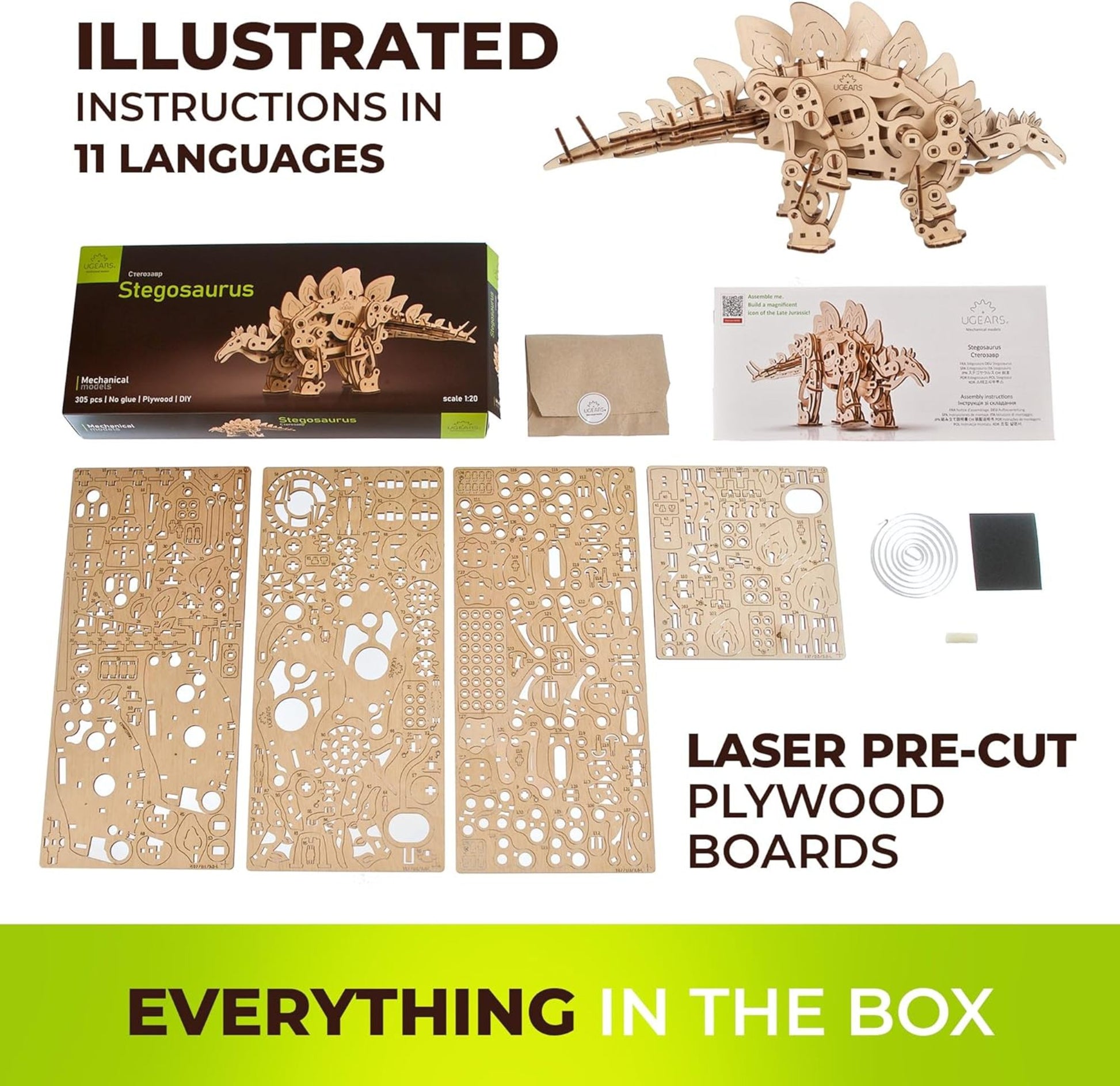 The Ugears Stegosaurus is a "Medium" level model. Kids are fascinated by dinosaurs, so why not help your child, niece or nephew, or grandchild build their very own walking dinosaur, then enjoy imaginative play together? The Stegosaurus has 305 parts, and promises 8+ hours of exciting assembly time. You won't need glue or special tools to build your mechanical dinosaur model. Just snap the art-quality wooden pieces together following the step-by-step instructions in 11 languages (English, German, Ukrainian, French, Polish, Spanish, Portuguese, Japanese, Italian, Chinese and Korean). Be sure to sand and lubricate all moving parts with the included piece of sandpaper and wax, "developing" the gears, so that your mechanical dino puzzle runs smoothly.