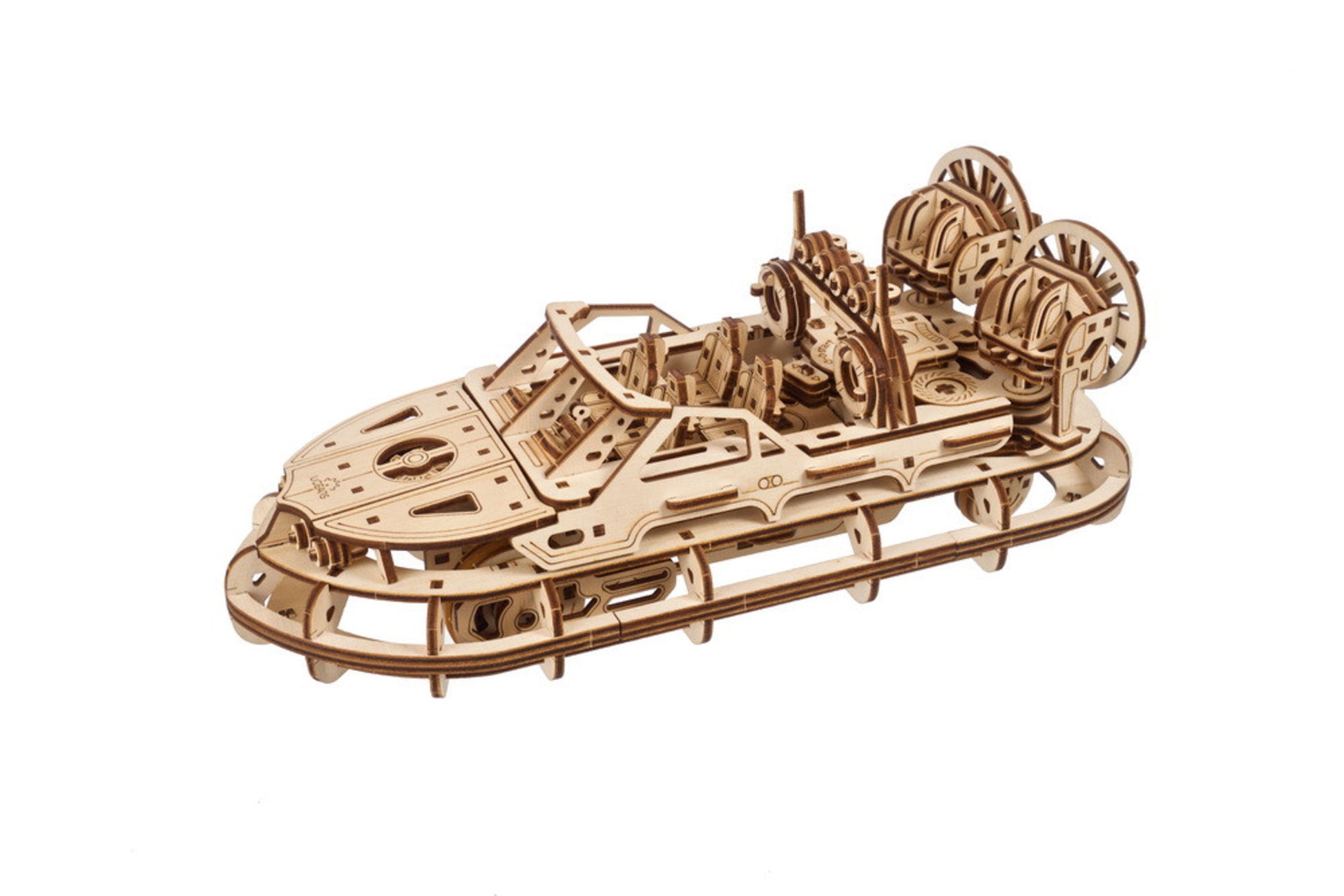 The Ugears Rescue Hovercraft is a 1:24 scale wooden model of a sleek, twin-propeller all-terrain hovercraft. This DIY wooden model is driven by a spring motor, with a windup ratchet key located on the craft's undercarriage. A Start/Stop switch allows you to wind the engine by giving ten clockwise turns, then engage the motor as the twin thrust propellers spin and the boat executes graceful, preprogrammed left and right turns over a distance of 3 meters, imitating the gentle swaying motion of real hovercraft.