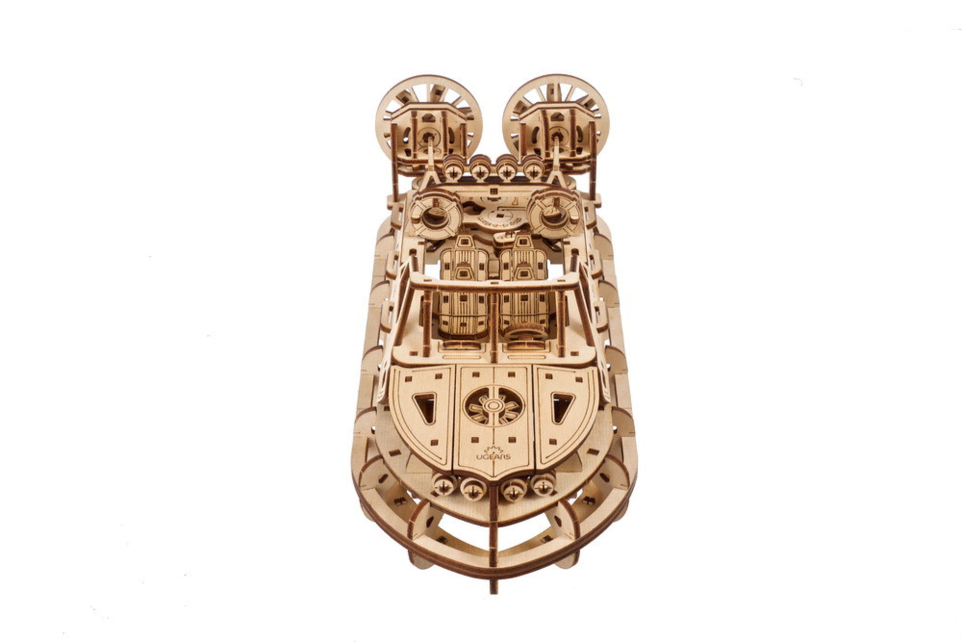 Outstanding realism, clever design and attention to detail are the hallmarks of Ugears models. The Rescue Hovercraft features a wide air cushion skirt, a movable, hand-operated lift fan in the bow, laser-engraved lift fans aft, two large engine-driven thrust fans, helm and cockpit with seating for four, two mounted life preserver rings, headlamps built into the bow and search lights mounted aft of the cockpit for nighttime rescues.
