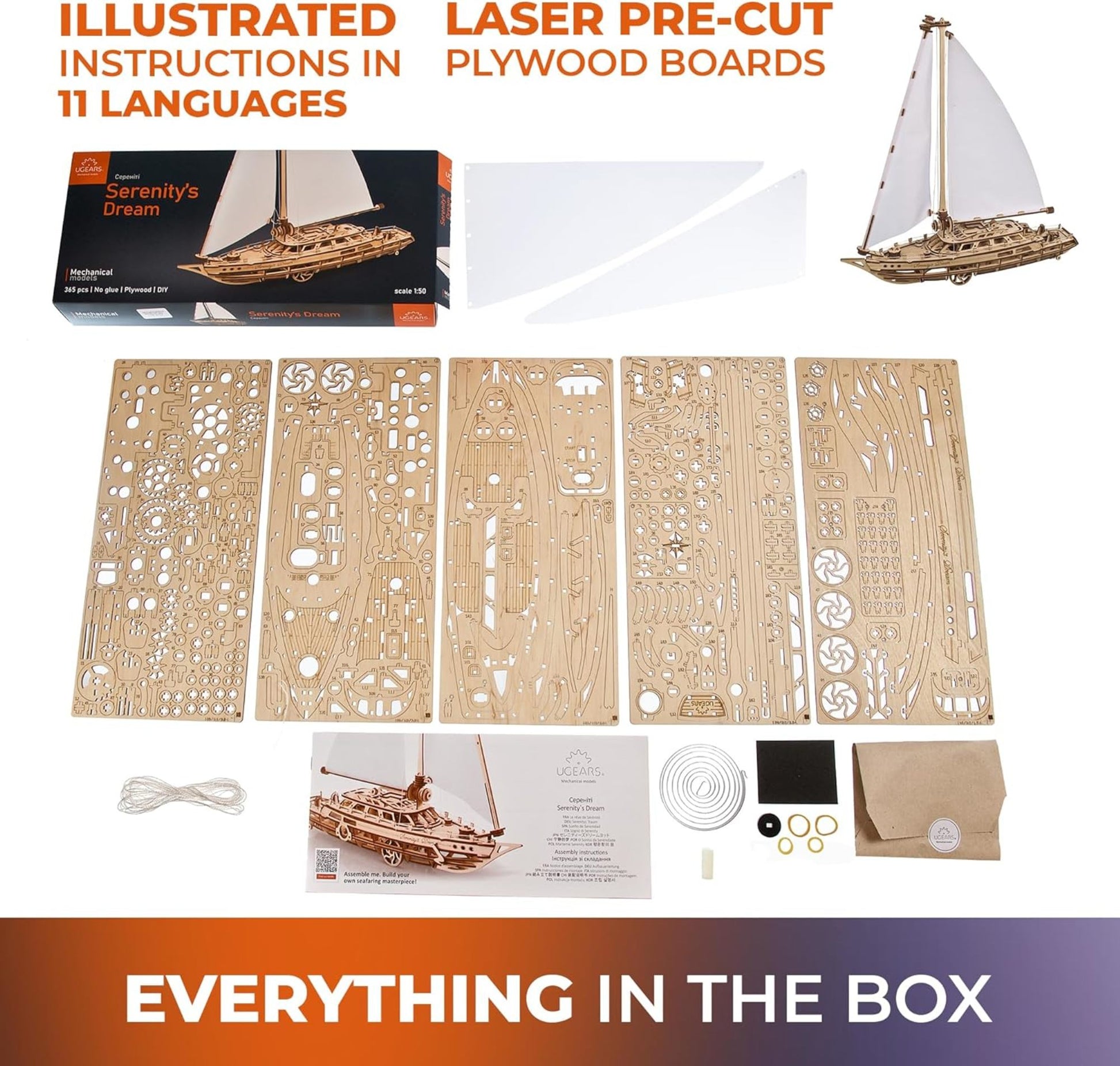 The Serenity's Dream 3D puzzle wooden sailboat model has 365 parts and is rated "Medium" difficulty, so it's a good build for modelers with a bit of experience. As with other Ugears mechanical marvels, you won't need glue or special tools to build this beauty, just punch the laser pre-cut pieces out of the art-quality composite wood boards, and snap them together. Illustrated instructions in 11 languages (English, German, Ukrainian, French, Polish, Spanish, Portuguese, Italian, Chinese, Japanese and Korean) guide your assembly, and each kit contains a piece of sandpaper and wax to smooth and lubricate the moving parts.