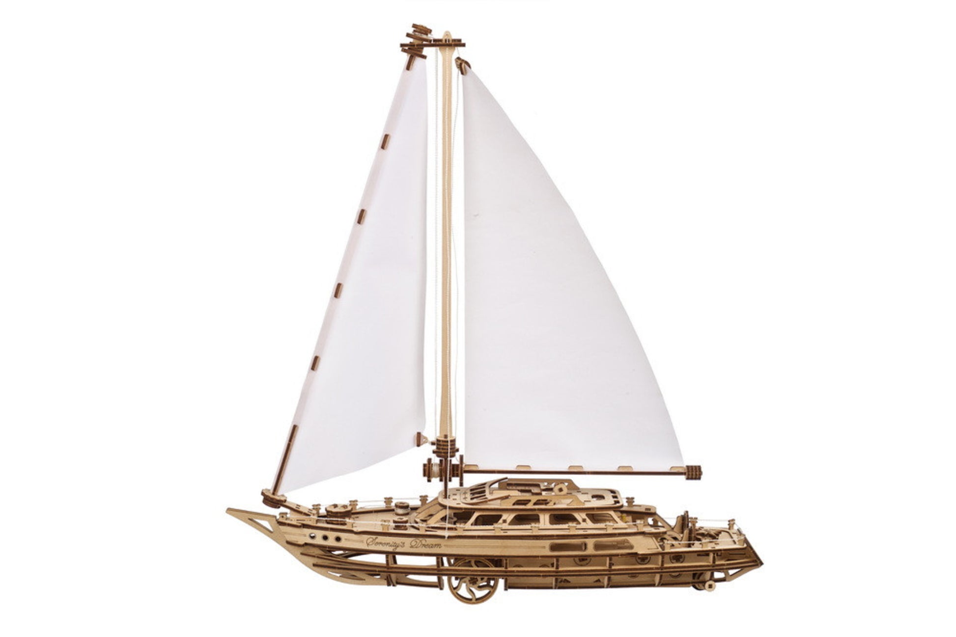 Sailors know the peaceful feeling of ocean sailing under a clear sky, a steady breeze filling the close-hauled white sails, as you skim the waves through a series of skillful tacks. It's that feeling of being one with nature and the elements, expertly beating to windward, feeling the boat pick up speed with the right sail trim. Invite a few friends along, maybe break out some wine and cheese in the evening—that's the dream, and you can live it with Serenity's Dream, the clever new mechanical yacht from Ugears.