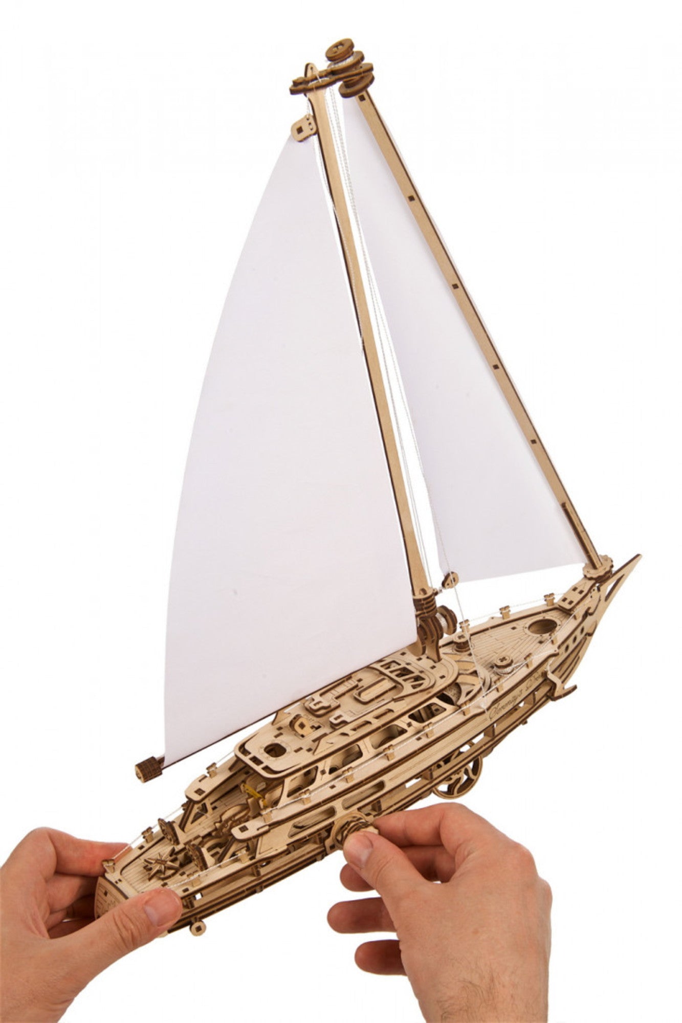You'll love the realistic details throughout this DIY wooden sailboat model, including two rigged paper sails—a mainsail and a jib headsail—with roller furling so you can furl and unfurl the sails with a simple twist. Check out the sleek cabin, stanchions and rope railing lining the deck, two helms for steering from the high side, retractable anchor, laser engraved planks on the foredeck, and reverse raked transom with engraved Ugears logo.
