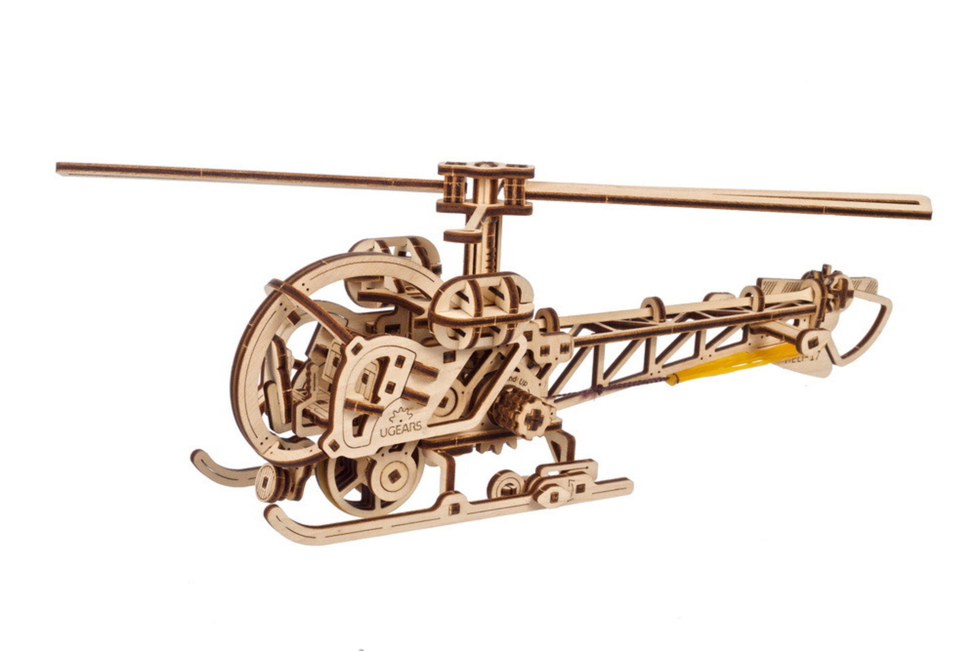 The Ugears Mini Helicopter is the first helicopter model in our Smart collection, joining the Mini Biplane, Mad Hornet, Steampunk Airship and Aviator (with interchangeable airplane and helicopter components) models in our Ugears family of fabulous flyers. The open design lets you really see all aspects of the DIY helicopter model. This 3D puzzle whirlybird is loaded with realistic details including a turning rotor mast and main rotor, turning tail rotor, twin seater cockpit with cyclic stick controls, doors that open, adjustable searchlight in front, retractable rear wheels, landing skids and a helipad on which to rest your model.