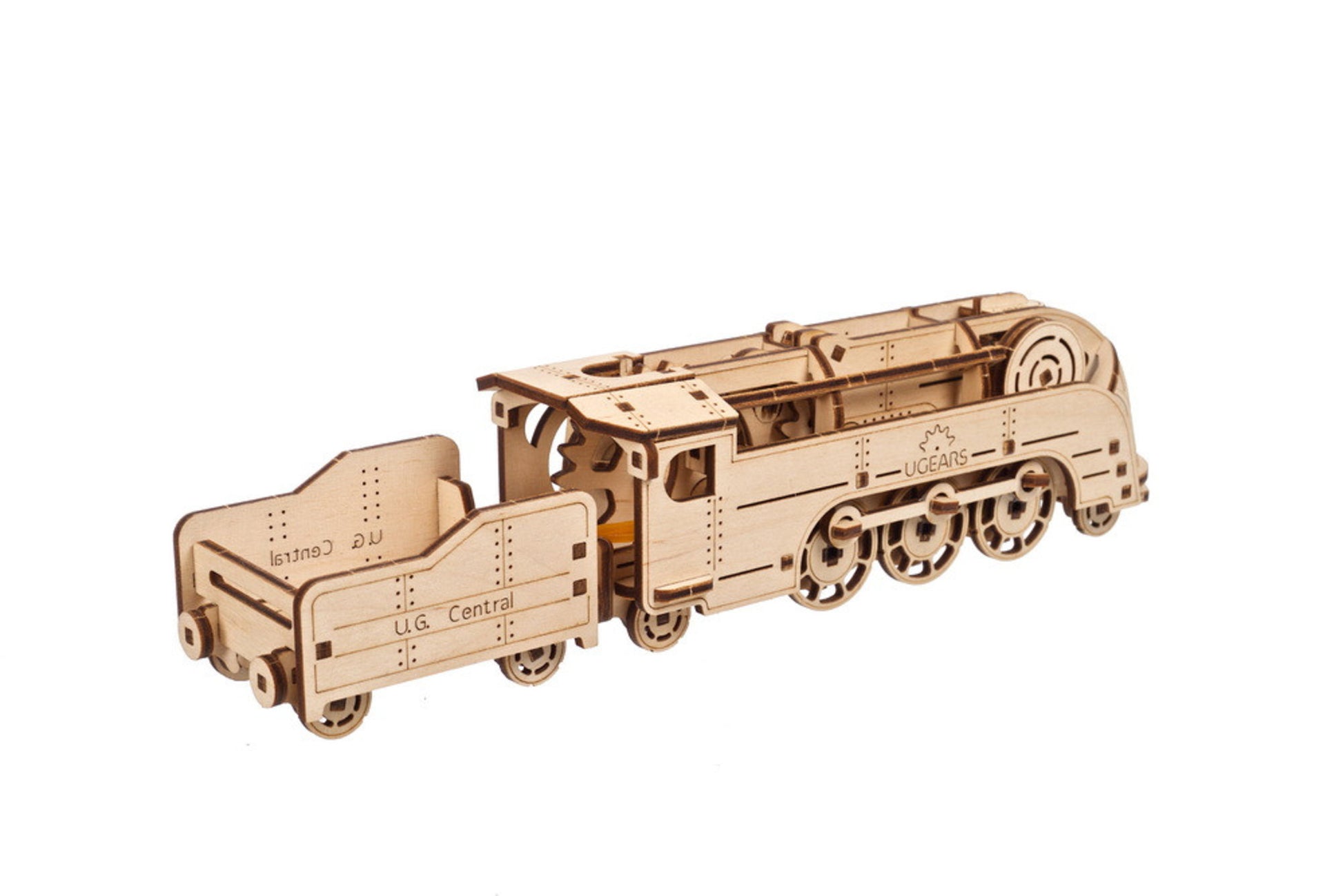 One of the great things about Ugears models is they can be built without glue or special tools. Everything you need for assembly comes right in the box. Just punch the laser pre-cut pieces out of their composite wood boards and snap together. Made from art-quality composite wood, Ugears models can be left in their attractive natural wood state, or colored, stained or painted in a color scheme of your choosing (paints not included). When assembling your Mini Locomotive remember to lightly sand and wax moving parts to make them run smoothly (wax and sandpaper included).