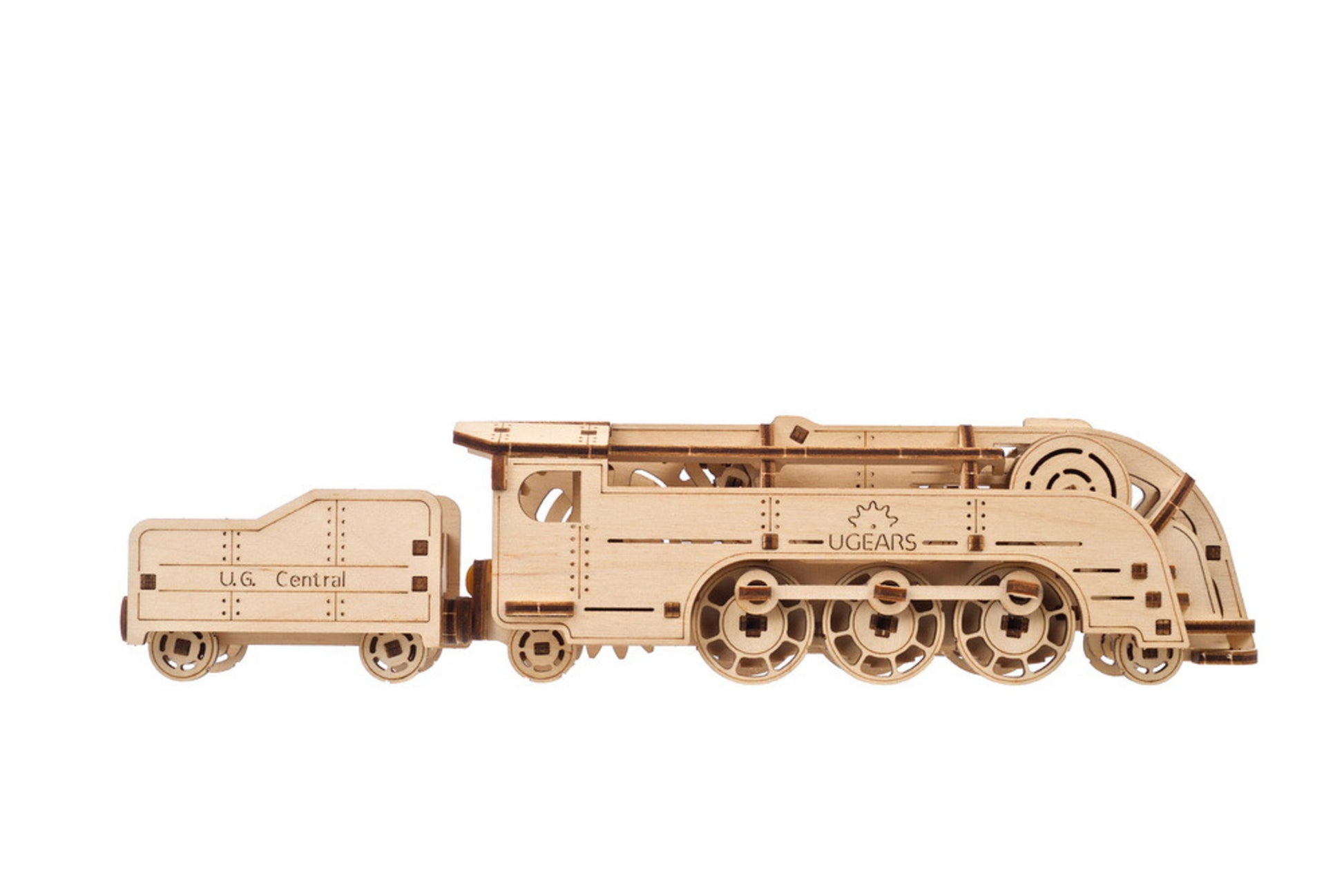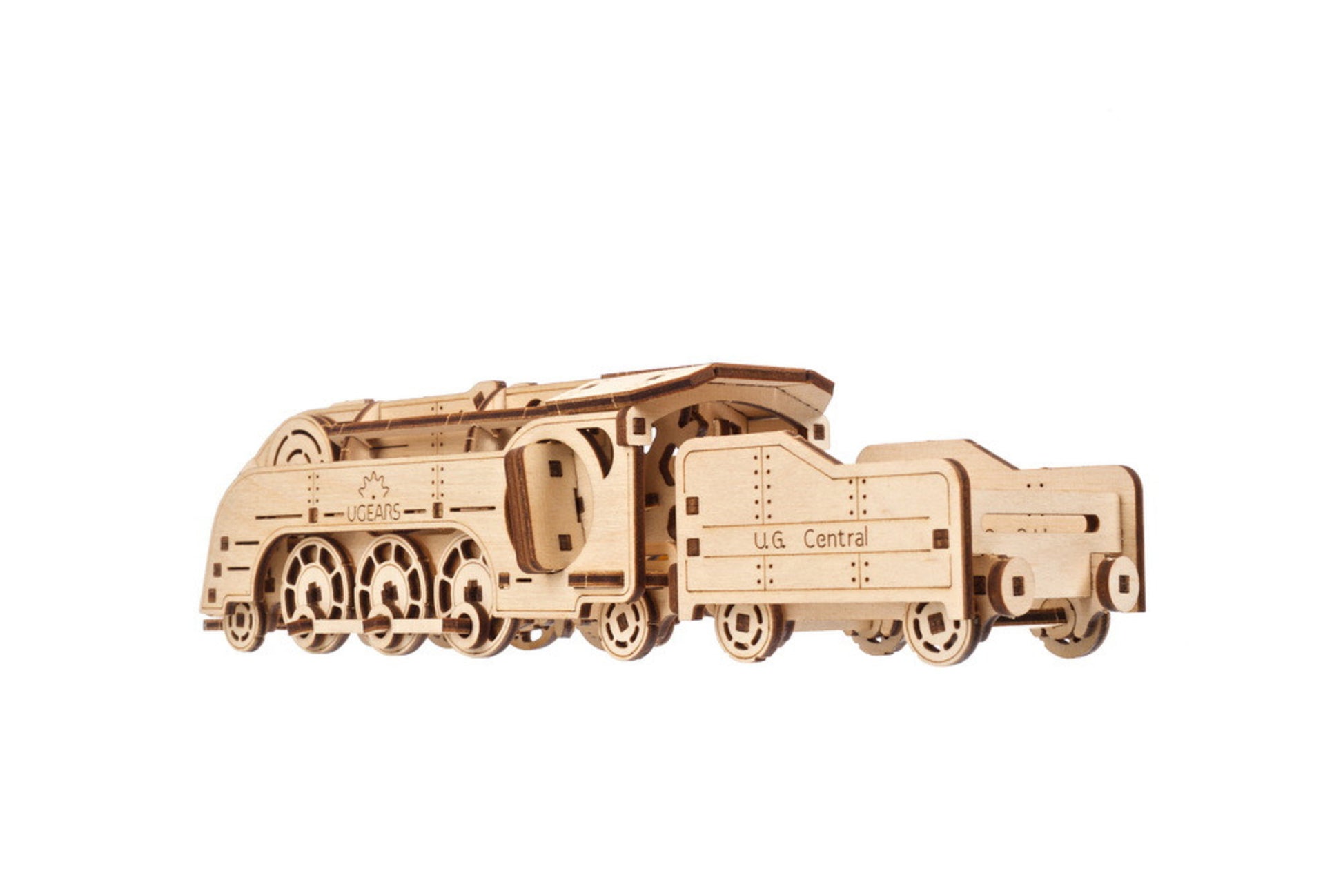 Ugears has designed some beautiful and challenging train models over the years, including the Locomotive, V Express Steam Train with Tender, and Hogwarts™ Express. With the Mini Locomotive from the new Smart collection, we bring you a simple, "Easy"-rated DIY train model that anyone can build, including junior train enthusiasts. This rubber band-powered wooden train (locomotive plus tender) model has surprising get up and go in such a compact body, and is able to travel over 2m on a single winding. Sleek, retro styling harkens back to the 1930's—the last decade when coal-fired steam locomotives held prominence.