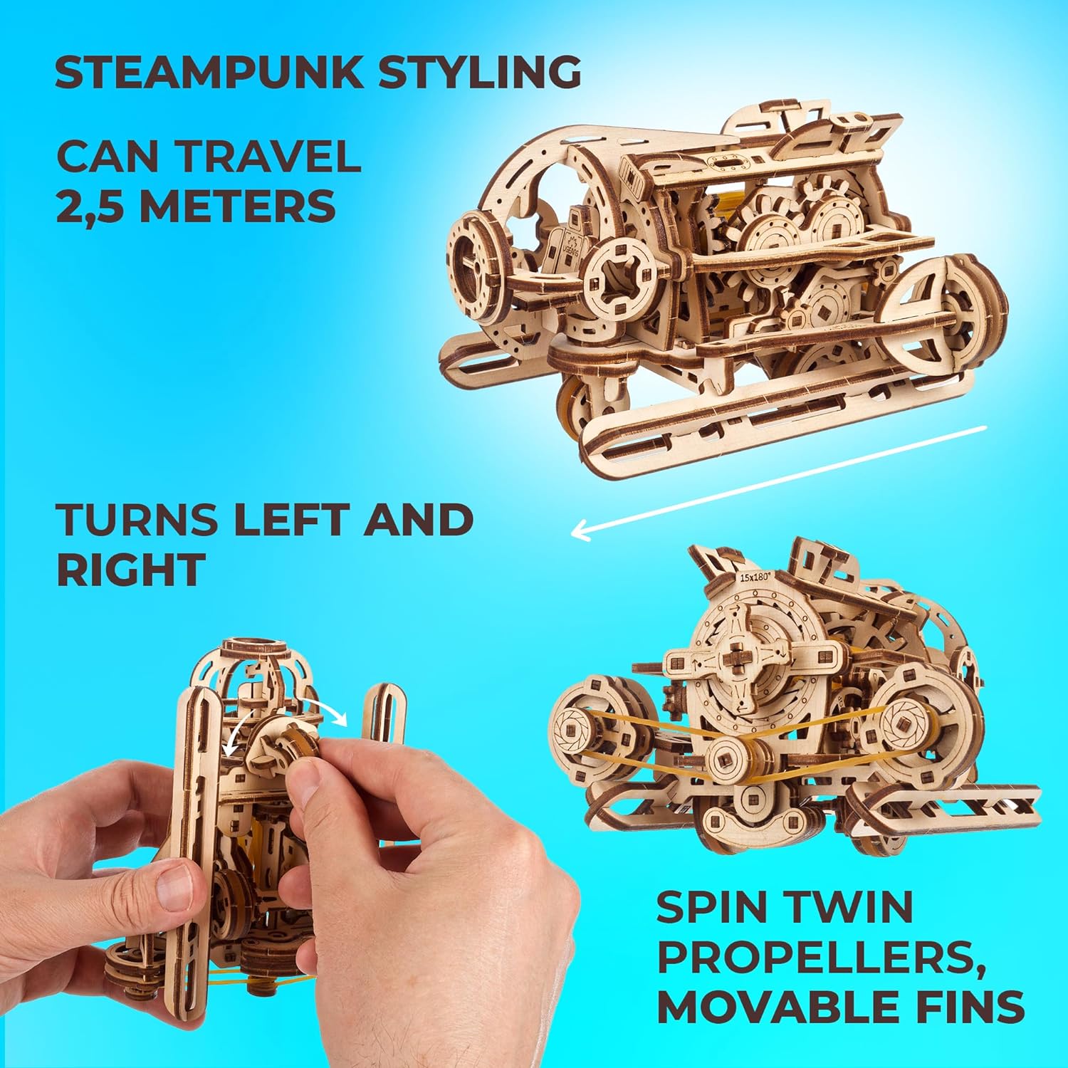 Our DIY wooden model Steampunk Submarine is scaled at 1:48, travels about 2.5 meters on its rubber band motor, features a Start/Stop switch for ease of operation, and can travel in a straight line or make left and right turns. The gear system actuates moving propellers to give your sub the illusion of underwater propulsion. Steampunk styling conveys the idea that this craft is no off-the-shelf production model, but rather the realization of one brilliant, eccentric inventor's passion for undersea exploration.
