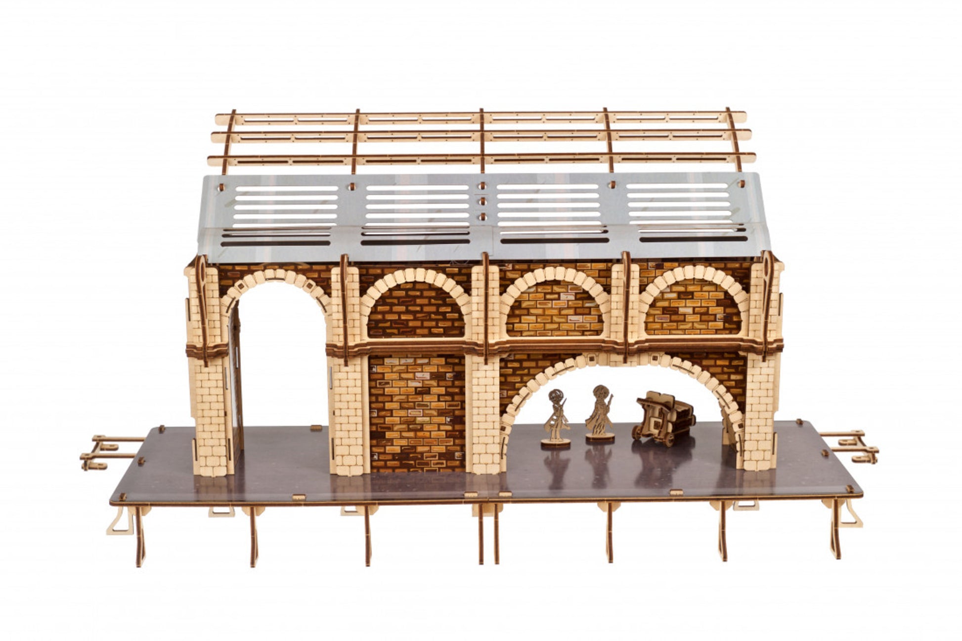 The enchanting wooden model Platform 9 ¾ by Ugears is a new addition to the Ugears Harry Potter™ collection (also featuring DIY wooden mechanical models of the Hogwarts™ Express, Flying Ford Anglia™, Knight Bus™, Hagrid's Flying Motorbike™ and Advent Calendar). This attractive train platform model is a static display that replicates the Victorian era look of King's Cross station with its beautiful brickwork and ceiling arch. The model includes a two-sided platform with upward curving arches, platform sign, a section of track, and two figurines of Harry and Ron with luggage trolley and suitcases loaded with their school things. Detailed decorative cardboard walls complete the realistic design look of the historic station.