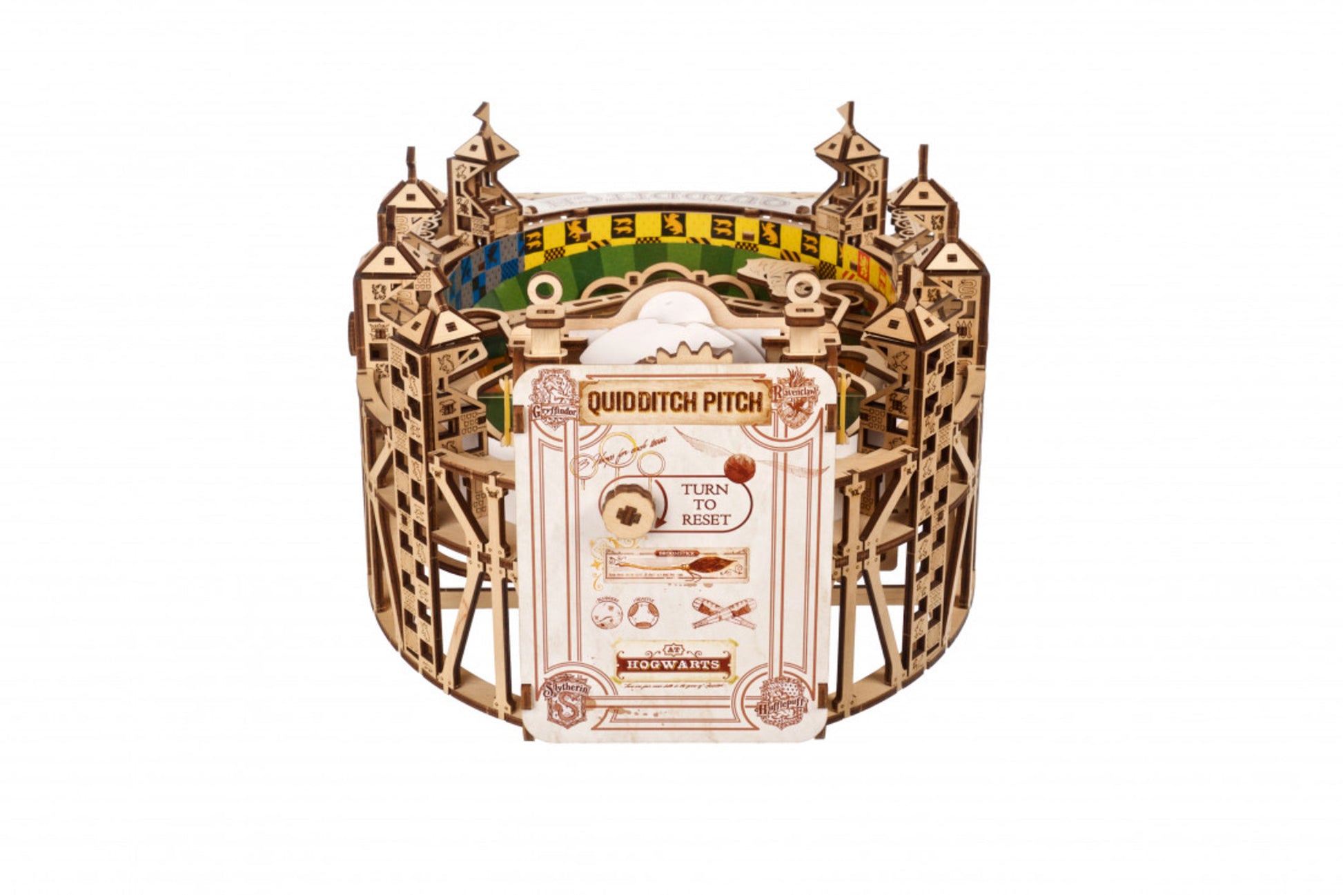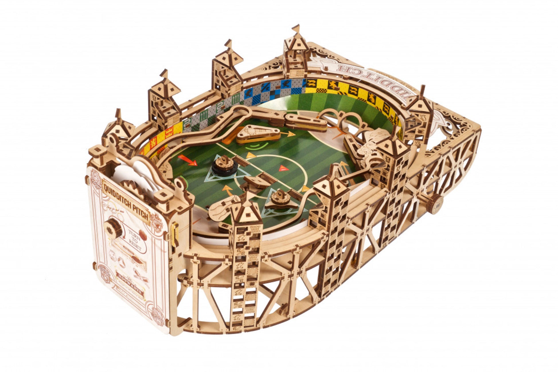 The DIY Ugears Quidditch Pinball model is a visually-stunning stadium, comprising a playing field made of cardboard printed with decorative elements, 8 elevated viewing platforms engraved with the logos of the four houses of Hogwarts (Gryffindor, Hufflepuff, Ravenclaw and Slytherin), functional scoreboard, a chest for storing the Golden Snitch and three Quaffle balls, and functional pinball game elements including flippers, bumpers, targets and obstacles.
